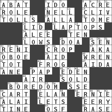 ACROSS 1. Blind as ____ 5. Wedding promise 8. 43,560 square feet 12. Hero or heavy, e.g. 13. 1994 drama film starring Jodie Foster 15. 154 in Roman numerals 16. For Whom the Bell _____ 18. Silent film actress Nazimova 19. Heavy book 20. Flaplike covering 22. Portable computers 24. Toward shelter 26. Nine, plus one 27. Coldest temperatures 28. ___ good deed 29. Elected rep. 32. Painter Guido (1575-1642) 35. Riding implement 37. Alias (abbr.) 38. Mitch Miller's instrument 39. Help 40. Songbird 41. Small child 42. Toadlike animal 43. Opera by Verdi 44. One (Scot) 45. Infant food 46. Genesis locale 49. Atmosphere 50. Exchanged or delivered for money 51. Mood resulting from idleness 55. Compass dir. 56. Haul 57. Enthusiasm 59. Bert's buddy 63. Jai ____ 64. Allows 65. Suggestive of the supernatural 66. Prong on a fork 67. Order of Saint Francis (abbr.) 68. To erase DOWN 1. Nonscientific branch of learning 2. Oct. 31 cry 3. Everything 4. Copy Pinocchio 5. _ tizzy (2 wds.) 6. Small valley 7. Rounded earthenware pot or jar 8. NE Massachussets city 9. Hoof sound 10. Basketball hoops 11. Night before a holiday 14. Portable computer 17. Grain storage tower 21. Morning condensation 23. Beverage made from leaves 25. Fortification 28. Evades 29. Indian skirt 30. Made supply last 31. Grandmother 32. Round or rotation of duties 33. Inky black, to poets 34. Musical sound 36. _ de Janeiro 40. Nomad 42. Bundle 45. Sliced dessert 47. Two (Sp.) 48. Otherwise 49. Nick name for Arthur 51. Indonesian resort city 52. NW Algerian seaport 53. Butter sub 54. Floor protectors 56. Feline 58. Overdraft (abbr.) 60. Teachers' org. 61. Big collection agency 62. Sight organ