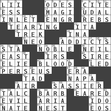 ACROSS 1. Cards in a Roman deck? 4. Lyric poems 8. Quote 12. Double-curved letter 13. Wise men 14. Hereditary estate 15. An arm off of a larger body of water 18. Engineer (abbr.) 19. Confederate soldiers (slang) 20. Pulling into pieces 22. Call ___ day 23. Long journey 24. _ tizzy (2 wds.) 25. Modern: prefix 26. Inveterate users 30. R.R. building 33. Having high moral qualities 36. Famous astronaut Armstrong 37. Compass direction 39. Big collection agency 40. Father 41. Writer Wiesel 42. Vital fluid 44. Directed 45. Son of Zeus who helped slay Medusa 47. Period 50. Small amount or degree 51. California wine valley 53. Atmosphere 54. More disrespectful 57. Baby powder 59. Sharp remark 61. Having ears or earlike features 63. Morally bad or wrong 64. Operatic vocal solo 65. Wedding promise 66. Nathan's nickname 67. A home for chicks 68. Greek goddess of the dawn DOWN 1. Flowery wreath 2. Is not 3. Small island 4. Presage 5. Mild oath, euphamism for damn 6. Oval reproductive body of a fowl 7. Title for a knight 8. Window treatments 9. The main thing one is thinking about 10. Bar bill 11. Raised railways 16. Merit 17. Relationship diagram 21. Visual representation of an object 22. Working for oneself (abbr.) 24. Binary compound 26. In addition 27. To provide with a ceiling 28. Hoop that covers a wheel 29. Downhill vehicle 30. Ooze 31. Story 32. SW Saudi Arabia district 34. Lubricates 35. Sis' sibling 38. One of the two male reproductive glands 42. Partially opened flower 43. Cub Scout units 46. Hearing organ 48. To erase 49. Capital of Western Samoa 52. Nest on high 53. Came down and settled, as after flight 54. Indian titles of respect 55. Blind as ____ 56. Do over again 57. Nine, plus one 58. Actress Gardner 59. Prohibit 60. "We ___ not amused" (Victoria) 62. Two (Sp.)