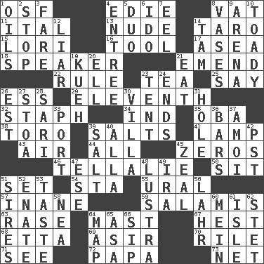 ACROSS 1. Order of Saint Francis (abbr.) 4. Singer Brickell 8. Large container 11. Slanted text style (abbr.) 13. Unadorned 14. Edible starchy tuberous root 15. Australian parrot (variant) 16. Instrument 17. Toward the sea 18. Orator 21. Make improvements or corrections to 22. Governing power 23. Beverage made from leaves 25. Declare 26. Double-curved letter 29. Veterans Day date 32. Staphylococcus 34. Working for oneself (abbr.) 35. Chief or king in Benin or Nigeria 38. "Corrida" creature 39. Table seasonings 41. Desk light 43. Atmosphere 44. Everything 45. Nothings 46. Copy Pinocchio 50. Be seated 51. Put into a specified state 54. R.R. building 55. Mountain range 57. Silly 59. Deli grouping 63. Raze (variant) 64. Vertical spar for supporting sails 67. Behest 68. Singer James 69. SW Saudi Arabia district 70. Cause heat under the collar 71. Observe 72. Dad 73. Fish or hair follower DOWN 1. Petroleums 2. Discontinue 3. Conductor's collection 4. Main course 5. Superhero pair 6. Wedding promise 7. Snakelike fish 8. Flower holders 9. Sports stadium 10. Sycophant 12. One who doesn't tell the truth 14. Scottish cap 19. Malaysian steamed pastry 20. Pipe bend 21. Ingest 23. Portable shelter 24. Conclusions 26. Eastern Standard Time (abbr.) 27. Portico 28. Indian skirt 30. Country residence 31. Hollow 33. Left side of a ship or aircraft 36. Taverns 37. Mine, in Marseilles 39. Table seasoning 40. Silent film actress Nazimova 42. Pacific Standard Time (abbr.) 45. Ardor 47. Compass dir. 48. A period of five years 49. Retirement account (abbr.) 51. Fathers 52. Maternal 53. Clothes sense 56. Cowardly lion portrayer 58. Teachers' org. 60. Count _ (2 wds.) 61. Capri or Wight 62. Proofreading order 64. Atlas unit 65. White ___ sheet 66. Small drink