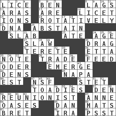 ACROSS 1. Louse (plural) 5. Benjamin's nick name 8. Straggles 12. Ancient river in northeast Turkey 13. "We ___ not amused" (Victoria) 14. It is permitted: Lat. 15. Charged particles 16. Happening in regular succession 19. Heredity factor (abbr.) 20. Choose not to consume 21. Thick slice 23. Had dinner 24. Ripen 27. Cole _ (cabbage dish) 30. To trail on the ground 31. Cylindrical with tapered ends 34. Singer James 35. Short letter 38. Swap 40. Nourish 41. Baltic tributary 42. Develop 44. Hiding places for outlaws 45. California wine valley 46. Eastern Standard Time (abbr.) 47. Science/research agcy. 50. Proofreading order 53. Sycophants 57. Lair 59. One who advocates reunion 63. Queen of England 1702-14 64. Fertile tracts in a desert 65. Daniel's nick name 66. Floor coverings 67. Cy Young winner Saberhagen 68. Retirement account (abbr.) 69. Inconspicuous attention getter DOWN 1. Put down 2. Metal shackles 3. Lessep's creation 4. Double-curved letter 5. Sharp remark 6. Greek god of love 7. Remaining after all deductions 8. 54 in ancient Rome 9. Adept person 10. Set 11. Filthy place 14. Actor's bit 17. Auto club (abbr.) 18. Teat (slang) 20. Competent 22. Michaelmas daisies 24. Johnson of "Laugh-In" 25. Yard entry 26. Mild oath 28. Nonscientific branch of learning 29. We are 30. Outscore 32. Scottish cap 33. Genesis locale 35. Thickened enlargement 36. Lyric poems 37. Portable shelter 39. Epoch 43. Global Positioning Systems (abbr.) 47. Nuclear Threat Initiatives 48. "Barney Miller" actor Jack 49. Avid follower 51. Ferber et al. 52. Portable shelters 54. "You Light Up My Life" star Conn 55. Austrian river, tributary to the Danube 56. Inactive volcano in Sicily 58. Egg locale 59. Director Reiner 60. Hearing organ 61. Purpose 62. Fish or hair follower 63. Electrical Unit