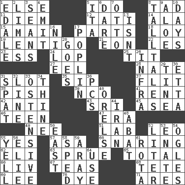 ACROSS 1. Otherwise 5. Wedding promise 8. Bit 11. South Vietnam president (1954) 12. Jacques of French films 14. In the manner of 15. At full speed 17. Pieces 18. Myrna of the movies 19. Small, flat, pigmented spot on the skin 21. Age 22. French article 23. Curvy letter 24. Chop off 25. Teat (slang) 27. Snakelike fish 28. Nathan's nickname 31. Notch 35. Small drink 37. Secret move to avoid paying debts 38. Expression of disdain 39. Non-commissioned officer (abbr.) 41. Monthly bill 42. Opposed to 43. _ Lanka 45. At sea 46. Adolescent 47. Period 49. Born 51. Experiment locale 52. Lion 55. Consenting reply 57. White ___ sheet 60. Catching in a trap 62. Biblical high priest 63. Upset 65. Add up to 66. 54 in ancient Rome 67. Afternoon social gatherings 68. Wig 69. Area sheltered from the wind 70. Color 71. Ancient Greek god of war DOWN 1. Peak District village in England 2. Citrus fruits 3. Seines 4. Give off 5. Call ___ day 6. Have the gumption 7. "Beetle Bailey" pooch 8. Baron Munchausen's specialties 9. _ vera 10. 24-hour periods 13. Is not 16. Mediterranean tributary 17. Cotton for raincoats, e.g. 20. Leaves 26. Kind of red light 29. Prong on a fork 30. Singer James 31. Argument over a trivial matter 32. Actor's bit 33. Clearly or manifestly demonstrative 34. One or ones belonging to thee 36. Personal Computers (abbr.) 40. Threatening words 44. SW Asia republic 48. Blind as ____ 50. 90 degrees 52. 61 cubic inches 53. Related on the mother's side 54. Stares 55. Shout 56. Writer Wiesel 58. Moved rapidly 59. Like ___ of sunshine 61. Round or rotation of duties 64. Purpose