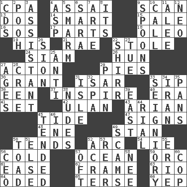 ACROSS 1. Accounting whiz (abbr.) 4. Slender Brazilian palm 9. Examine minutely or intensely 13. Two (Sp.) 14. Don Adams' spy role 15. Diluted with white 16. Distress signal 17. Pieces 18. Butter sub 19. Part of HMS, perhaps 21. Actress Charlotte 22. Took without asking 24. Thailand, formerly 26. Attila the _ 27. Gambison 29. Sliced desserts 30. Monetary aid 31. Austrian river, tributary to the Danube 33. Small drink 36. Car or cant ending 37. Stimulate to action 40. Epoch 41. Put into a specified state 42. ____ Bator 43. Believer in; advocate of (suffix) 45. Event that recurs at intervals 47. Signals 48. Compass dir. 49. Comedian Laurel of Laurel & Hardy 50. Looks after 52. Curve 54. Whopper 56. Lacking warmth 57. Sea 59. The grampus (Milton) 61. Comfort 62. Movie unit 63. River (Sp.) 64. Wrote a lyric poem 65. Laconic 66. Slangy assent DOWN 1. Music discs 2. "Silly old bear" 3. Helper 4. Cleo's killer 5. Excessive but superficial compliments 6. "Two Mules for Sister ____" 7. Johnson of "Laugh-In" 8. ___ a Wonderful Life 9. Soup utensils 10. Give a ring to 11. Toward shelter 12. Modern: prefix 20. The Jewish people; Israel 22. Bake eggs in their shells 23. Third day of the wk. 25. Opposed to 27. Ripens 28. Algonquian 29. Ache 31. Capri or Wight 32. Health resort 33. Signiory (variant) 34. SW Asia republic 35. Zero-star reviews 38. Unadorned figures 39. Compass direction 44. Monetary unit of Yemen 45. Watched over 46. Indiana (abbr.) 49. Fraudulent business schemes 50. Frog relative 51. Otherwise 52. Land measure 53. Stern 55. 4th largest of the Great Lakes 56. Corporate head (abbr.) 57. Often (poetically) 58. Born 60. Police officer (slang)