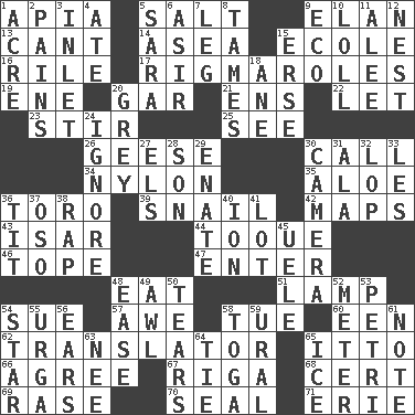 ACROSS 1. Capital of Western Samoa 5. Table seasoning 9. Flair 13. Patter 14. At sea 15. Learning spot: Fr. 16. Cause heat under the collar 17. Frustrating wastes of time 19. Compass dir. 20. Slender fish 21. Followers of ems 22. Allow 23. Agitate 25. Perceive with the eye 26. Honkers 30. Give a ring to 34. High-strength synthetic material 35. Medicinal plant 36. "Corrida" creature 39. Slow-paced one 42. Atlas contents 43. Austrian river, tributary to the Danube 44. Woman's close-fitting hat 46. Drink excessively 47. Keyboard key 48. Ingest 51. Desk light 54. Institute legal proceedings 57. Deep reverence 58. Third day of the wk. 60. Car or cant ending 62. Interpreter 65. "Tell ____ the Marines!" 66. Match 67. Capital of Latvia 68. Certainty 69. Raze (variant) 70. Lick closed 71. 4th largest of the Great Lakes DOWN 1. 1/640 square mile 2. Aches 3. An arm off of a larger body of water 4. Had dinner 5. "Two Mules for Sister ____" 6. SW Saudi Arabia district 7. Part of a journey 8. Softens 9. Environmental prefix 10. Hang loosely or laxly 11. Toward shelter 12. A home for chicks 15. Celtic language 18. A saturated hydrocarbon 20. Jennifer or Joel 24. Disregard 27. Raised railways 28. Male child 29. Related on the mother's side 30. Device for capturing images 31. Chicken ___ king 32. Trim (branches) 33. French article 36. Teat (slang) 37. Bear (Spanish) 38. Reproach for some lapse or misdeed 40. Electrically charged atom 41. Car dealer's back yard 45. Ubangi River tributary 48. Comfort 49. Leather borer 50. Pulls into pieces 52. Distance measurement 53. _ dish (used to culture cells) 54. Play the lead 55. Capital and largest city of Mongolia 56. Hearing organs 58. Ancient Roman robe 59. Mountain range 61. Short letter 63. Born 64. Neckwear 65. Frozen water