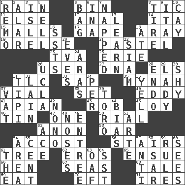 ACROSS 1. Precipitation 5. Storage container 8. Nervous spasm 11. Otherwise 12. Of or related to the anus 14. Call ___ day 15. Shopping centers 17. Open wide 18. Like ___ of sunshine 19. Threatening words 21. Soft color 23. Federal power corp. 25. One of the Great Lakes 26. One who makes use of a thing 27. Heredity factor (abbr.) 28. Raised railways 31. Affectionate concern, for short 33. Plant excrement 35. Non-adult bird? 37. Small bottle 38. Put into a specified state 40. Whirlpool 41. Bee-related 43. Director Reiner 45. Myrna of the movies 46. Metal container 47. Single 50. Monetary unit of Yemen 52. At once, immediately (arch.) 53. Rowing implement 54. Buttonhole 56. Flight of steps 61. Woody plant 62. Greek god of love 65. Follow as a consequence or result 66. Layer 67. Oceans 68. Story 69. Consume 70. Lizard (obsolete) 71. Angers DOWN 1. San ____ (Riviera town) 2. Having or resembling wings 3. Capri or Wight 4. 1994 drama film starring Jodie Foster 5. Paper or plastic container 6. _ tizzy (2 wds.) 7. Slept 8. Hoop that covers a wheel 9. Slanted text style (abbr.) 10. Island 13. Memorize 16. Fast planes 18. Had dinner 20. Nights before holidays 22. Thailand, formerly 24. Ancient river in northeast Turkey 26. Southern CA. univ. 28. Inside; within (prefix) 29. Kenny Rogers chart-topper in '80 30. Like a shrinking violet 31. Native american tent (variation) 32. (Had) reclined 34. For each 36. Shout 37. Large container 39. "Corrida" creature 42. Words to Nanette 44. Prejudice 48. Olfactory organs 49. Main course 51. Johnson of "Laugh-In" 52. Adept person 54. Length times width 55. Penny 57. Opposed to 58. Austrian river, tributary to the Danube 59. Governing power 60. Perceives with the eye 61. Definite Article 63. Clumsy lout 64. Fast jet (abbr.)
