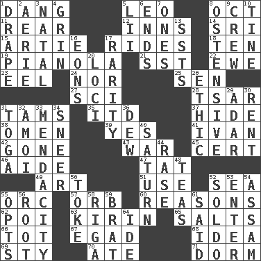 ACROSS 1. Mild oath, euphamism for damn 5. Lion 8. Sep. follower 11. Located in or toward the back 12. Taverns 14. _ Lanka 15. Nick name for Arthur 17. Amusement-park features 18. "___ Little Indians" 19. Player piano 21. Fast jet (abbr.) 22. She-sheep 23. Snakelike fish 24. Not either 25. Elected rep. 27. _-fi 28. Russian ruler of old 31. Scottish caps 35. It would 37. Flintstone garb 38. Sign of things to come 39. It is so 41. _ the terrible 42. Went 43. Armed conflict 45. Sure thing 46. Helper 47. Make lace 49. Tate display 51. Purpose 52. Ocean 55. The grampus (Milton) 57. Globe 60. Thinks logically 62. Luau course 63. Japanese brewing company 65. Table seasonings 66. Small child 67. Mild oath 68. The main thing one is thinking about 69. Filthy place 70. Had dinner 71. Dormintory (informal) DOWN 1. Window treatment 2. Nest on high 3. Relating to or accompanying birth 4. Amused look 5. Cards in a Roman deck? 6. Extremities 7. Singles 8. Clearly or manifestly demonstrative 9. Group working together 10. Prong on a fork 13. Fast planes 16. Immeasurably long periods of time 17. Noteworthy scarcity 20. Event scenes 26. Moral principle 29. The sixth month of the Jewish calendar 30. Monthly bill 31. Ancient Roman robe 32. Mine, in Marseilles 33. Ananias' fault 34. Scornful expression 36. Morning condensation 40. Titan orbits this 44. To erase 48. Afternoon social gatherings 50. Puff or smoke 52. Twentieth part of a lira 53. Keyboard key 54. Indian state 55. Elects 56. Carrot, for example 58. Capital of Latvia 59. Naughty child 61. Expressed in words 64. Binary compound