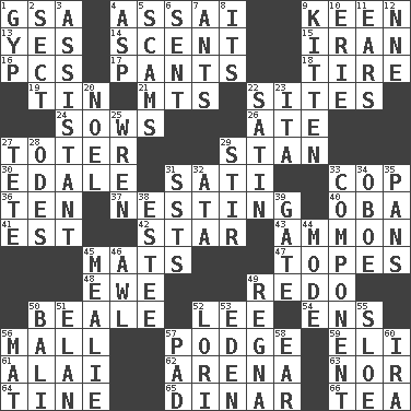 ACROSS 1. Girls' org. (abbr.) 4. Slender Brazilian palm 9. Peachy ____! 13. It is so 14. Aroma 15. SW Asia republic 16. Personal Computers (abbr.) 17. Leg coverings 18. Become fatigued 19. Metal container 21. Mountains (abbr.) 22. Locates 24. Sty mamas 26. Had dinner 27. Carrier 29. Comedian Laurel of Laurel & Hardy 30. Peak District village in England 31. Suttee (variant) 33. Police officer (slang) 36. "___ Little Indians" 37. Nestling 40. Chief or king in Benin or Nigeria 41. Eastern Standard Time (abbr.) 42. Play the lead 43. ID or VA city 45. Floor protectors 47. Drinks excessively 48. She-sheep 49. Make new 50. Calif. Air Force Base 52. Area sheltered from the wind 54. Followers of ems 56. Shopping center 57. Porridge 59. Connecticut Ivy Leaguer 61. Mountain range southwest of Kyrgyzstan 62. Sports stadium 63. Not either 64. Prong on a fork 65. Middle Eastern gold or silver currency 66. Afternoon social gathering DOWN 1. Con 2. Religious group 3. Aide 4. Viper 5. Fraudulent business schemes 6. Transmitted 7. Pismires 8. It is 9. Baby cat 10. One of the Great Lakes 11. Hearing organs 12. Compass dir. 20. Christmas carol 22. Smooth fabric 23. Call ___ day 25. Songbird 27. Wig 28. Lyric poems 29. Agitate 31. Fast planes 32. "One Day ___ Time" 33. Piece 34. Mitch Miller's instrument 35. Baking dishes 38. First name in cosmetics 39. Yard entry 44. Method 45. Ear of corn 46. Leather borer 49. Canadian anthropologist Darnell 50. Indonesian resort city 51. Flair 52. Australian parrot (variant) 53. Locale of original sin 55. A type of plum 56. Floor covering 57. Writing tablet 58. Hearing organ 60. Retirement account (abbr.)