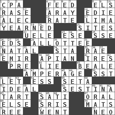 ACROSS 1. Numbers guy (abbr.) 4. Nourish 8. Raised railways 11. To erase 13. Like ___ of sunshine 14. Singer Brickell 15. Actor Baldwin 16. Pace 17. Pale green bean 18. Had a strong desire 21. Settings 22. Ubangi River tributary 23. Compass dir. 25. Compass dir. 26. Begley and Asner 29. One to whom something is allotted 32. Brizilian seaport 34. R.R. building 35. Actress Charlotte 38. Independent ruler or chieftain 39. Bee-related 41. Angers 43. Before (prefix) 44. Untruth 45. Calif. Air Force Base 46. Electrical Measurement 50. Fast jet (abbr.) 51. Allow 54. Double-curved letter 55. Bristle 57. Perfect 59. French poetic form 63. Small pie 64. Suttee (variant) 67. Relating to the mouth 68. Otherwise 69. Indian titles of respect 70. Floor coverings 71. Portuguese money of account (variant) 72. Gone 73. Modern: prefix DOWN 1. Supercomputer manufacturer 2. Diluted with white 3. Toward the sea 4. Burden 5. Epoch 6. Consume 7. Color 8. Prepares for publication 9. Citrus fruits 10. Gospel singer Marvin 12. Shade of tan 14. Biblical high priest 19. Be tempered by heat 20. Pipe bend 21. Perceive with the eye 23. Singer James 24. Comedian Laurel of Laurel & Hardy 26. Compass dir. 27. Moist 28. Use a swizzle stick 30. Flexible twig of a willow tree 31. One of the Great Lakes 33. Type of rug 36. Caspian sea tributary 37. Snakelike fish 39. High mountains 40. Sliced desserts 42. Put into a specified state 45. Wagers 47. Cartoonist voice _ Blanc 48. Aid 49. Turn to the right 51. 61 cubic inches 52. Peak District village in England 53. Laconic 56. Tiny particle 58. Had dinner 60. SW Asia republic 61. Nathan's nickname 62. In addition 64. Compass dir. 65. "We ___ not amused" (Victoria) 66. Shallow baking pan