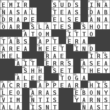 ACROSS 1. Independent ruler or chieftain 5. Soap bubbles 9. _ tizzy (2 wds.) 12. Relating to the nose 14. Afternoon social gatherings 15. Apply (a substance) by light strokes 16. Window treatment 17. Otherwise 18. Santa ___, CA 19. Rowing implement 20. Chalkboards 23. Guess 24. Smallest unit of an element 25. "Tell ____ the Marines!" 27. Bar bills 30. Fitting 32. Period 33. Length times width 34. Rendezvous 36. Indiana (abbr.) 38. Cartoonist voice _ Blanc 39. Actress Charlotte 40. Big collection agency 43. Small island 46. Blunders 48. Toward the sea 49. Quiet! 51. Arrange properly for use 52. Those things 53. Toward shelter 54. Ancient Roman robe 56. 1/640 square mile 58. Seem 61. Part of HMS, perhaps 64. Lion 65. Ancient river in northeast Turkey 66. Black 68. Zeal 69. Nuclear Threat Initiatives 70. Tall tales 71. Chicken ___ king 72. Is not 73. Political cartoonist Thomas DOWN 1. Inside; within (prefix) 2. Hindu Mythology: god of death 3. Austrian river, tributary to the Danube 4. Reproach for some lapse or misdeed 5. Proofreading order 6. Ubangi River tributary 7. Hyrax 8. Compass dir. 9. Potato state 10. Billionth: prefix 11. Blind as ____ 13. For fear that 21. Rich soil 22. Electrical Unit 23. Comedian Laurel of Laurel & Hardy 24. White ___ sheet 26. Three (prefix) 27. Scottish cap 28. "We ___ not amused" (Victoria) 29. Actor Lugosi 31. Pulls into pieces 35. Cylindrical with tapered ends 37. Food container 41. To separate or throw off 42. Declare 44. Capri or Wight 45. Definite Article 47. Portico 48. "One Day ___ Time" 50. Centers of feelings and intuitions 53. Odor 55. Jennifer or Joel 56. Inventor's middle name 57. To provide with a ceiling 59. Ache 60. Inconspicuous attention getter 61. Israeli folk dance 62. Restaurants 63. System (abbr.) 65. Black tropical American cuckoo 67. Forbid