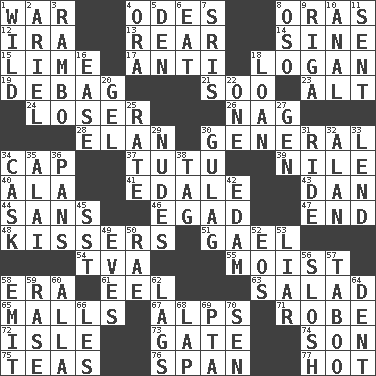 ACROSS 1. Armed conflict 4. Lyric poems 8. Mouths or openings 12. Retirement account (abbr.) 13. Posterior 14. Trig term 15. Welles in "The Third Man" 17. Opposed to 18. Utah city north of Ogden 19. Debunk (Brit. slang) 21. "Barney Miller" actor Jack 23. The first octave above the treble staff 24. Failure 26. Tired old horse 28. Enthusiasm 30. Commissioned military rank 34. Head covering 37. Ballerina skirt 39. The longest river in the world 40. In the manner of 41. Peak District village in England 43. Daniel's nick name 44. Without 46. Mild oath 47. Conclusion 48. Smoochers 51. Highlander 54. Federal power corp. 55. Wet 58. Epoch 61. Snakelike fish 63. First course 65. Promenades 67. High mountains 71. Loose flowing garment 72. Capri or Wight 73. Yard entry 74. Male child 75. Afternoon social gatherings 76. Connect, as a bridge 77. Being at a high temperature DOWN 1. Uncontrolled 2. Satellite of Uranus 3. Role for Stallone 4. Mouth or opening 5. Lair 6. Consume 7. Indian titles of respect 8. Bear (Spanish) 9. Capital of Latvia 10. Of or related to the anus 11. Emitted 16. Comfort 18. Grant temporary use of 20. Set 22. Single 25. Assign a rank or rating to 27. Commissioned mil. rank 29. Unadorned figures 30. POW camp 31. Travel on an animal 32. ____ Jay Lerner 33. Grant temporary use of 34. Keg 35. Jai _ 36. Baking dishes 38. Label 42. Dutch treat 45. Fast jet (abbr.) 49. Nights before holidays 50. Actress Charlotte 52. Greek goddess of the dawn 53. One who doesn't tell the truth 56. Splash clumsily 57. Off limits 58. Send forth 59. Raze (variant) 60. Silent film actress Nazimova 62. Fails to keep up a pace 64. Scratch 66. French article 68. Infant locale 69. Parent Teacher Association (abbr.) 70. Elected rep.