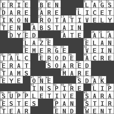 ACROSS 1. One of the Great Lakes 5. Benjamin's nick name 8. Fails to keep up a pace 12. Have the gumption 13. "We ___ not amused" (Victoria) 14. It is permitted: Lat. 15. Image 16. Happening in regular succession 19. Nine, plus one 20. Choose not to consume 21. Colored 23. Had dinner 24. According to 27. Goldbrick 30. Flair 31. Develop 34. Distinctive style or manner 35. Baby powder 38. Eat (away) 40. Land measure 41. Part of Q.E.F. 42. Flew 44. Scottish caps 45. Female horse 46. Sight organ 47. Single 50. Neighbor of Neb. 53. Motivate 57. Mouth edge 59. Supplementary 63. "Two Mules for Sister ____" 64. _____ Park, CO 65. Baking dish 66. Commotion 67. Separate forcefully 68. Conclusion 69. Left DOWN 1. Prepare for publication 2. Moved through 3. Literary sarcasm 4. Car or cant ending 5. Sharp remark 6. Greek god of love 7. Remaining after all deductions 8. 54 in ancient Rome 9. Adept person 10. Set 11. Filthy place 14. Actor's bit 17. Auto club (abbr.) 18. Teat (slang) 20. First of billions? 22. Opts 24. Actor Baldwin 25. Den 26. Singer Murray 28. Last letter of the English alphabet 29. Blunders 30. Dodged 32. Thick or sticky substance 33. Dutch treat 35. Wig 36. Like ___ of sunshine 37. Unable to walk 39. Period 43. Celtic language 47. Petroleums 48. Compass dir. 49. Eastern Standard Time (abbr.) 51. Having winglike extensions 52. Japanese brewing company 54. Corncob 55. "Terrible" tsar 56. Tear apart 58. Role in a play 59. Arrange properly for use 60. Purpose 61. Parent Teacher Assoc. 62. For each 63. Compass dir.