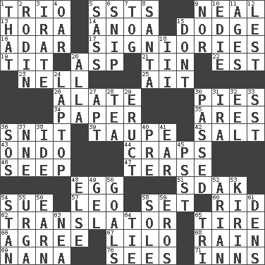 ACROSS 1. Musical group of three 5. Fast planes 9. Actress Patricia 13. Israeli folk dance 14. Small Philippine buffalo 15. Evade 16. The sixth month of the Jewish calendar 17. Seigniories (variant) 19. Teat (slang) 20. Cleo's killer 21. Metal container 22. Eastern Standard Time (abbr.) 23. 1994 drama film starring Jodie Foster 25. Small island 26. Having winglike extensions 30. Sliced desserts 34. Some stationery 35. Ancient Greek god of war 36. In a ____ (agitated or irritated) 39. Grayish beige 42. Table seasoning 43. Southwest Nigerian state 44. Dice game 46. Ooze 47. Laconic 48. Ovum 51. Neighbor of Neb. 54. Take to court 57. Lion 58. Arrange properly for use 60. To free from 62. Interpreter 65. Hoop that covers a wheel 66. Match 67. _ and Stitch 68. Precipitation 69. Nanny 70. Perceives with the eye 71. Lodging establishments DOWN 1. Not this but _ 2. "The Thinker" sculptor 3. Feeling or showing extreme anger 4. Rowing implement 5. Backtalk 6. Sever or remove by pinching or nipping 7. Coat; cloak 8. Before Barbara or Clara 9. Not either 10. Singer Brickell 11. Eras 12. For fear that 15. Do not 18. One more than two 20. Silent film actress Nazimova 24. Portable computer 27. Fitting 28. Beverage made from leaves 29. Spew [out] 30. Went by 31. Retirement account (abbr.) 32. Snakelike fish 33. Fast jet (abbr.) 36. Mayday 37. Compass dir. 38. Binary compound 40. Before (prefix) 41. Ewer handle 45. Inconspicuous attention getter 48. Otherwise 49. Set 50. Finish lines 52. Believer in; advocate of (suffix) 53. Japanese brewing company 54. Comedian Laurel of Laurel & Hardy 55. Capital and largest city of Mongolia 56. Merit 58. Flatfish 59. Greek god of love 61. Lairs 63. Teachers' org. 64. Make a knot 65. Three (prefix)