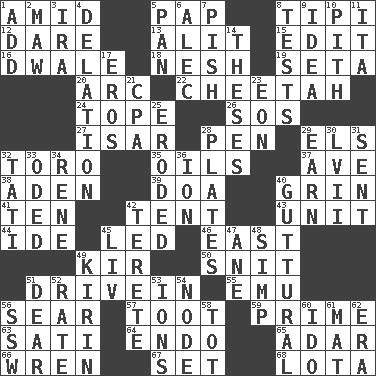 ACROSS 1. Among 5. Infant food 8. Native american tent (variation) 12. Have the gumption 13. Came down and settled, as after flight 15. Prepare for publication 16. A sleeping potion; an opiate (poet.) 18. Soft 19. Stalk of a moss capsule 20. Curve 22. Leopard's kin 24. Drink excessively 26. Distress signal 27. Austrian river, tributary to the Danube 28. Writing instrument 29. Raised railways 32. "Corrida" creature 35. Lubricates 37. "___ Maria" 38. An important port of Yemen 39. ___ good deed 40. Broad smile 41. Nine, plus one 42. Portable shelter 43. A single undivided whole 44. Binary compound 45. Directed 46. 90 degrees 49. Apertif with cassis 50. In a ____ (agitated or irritated) 51. Popular '50s hangout 55. Australian flightless bird 56. Burn superficially 57. A blast of a horn 59. A-one 63. Suttee (variant) 64. Inside; within (prefix) 65. The sixth month of the Jewish calendar 66. Songbird 67. Arrange properly for use 68. Globular water bottle used in Asia DOWN 1. Say or write further 2. Opening into something insatiable 3. Retirement account (abbr.) 4. Conveyance 5. Baking dish 6. Actor Baldwin 7. Expression of disdain 8. Trials 9. The main thing one is thinking about 10. Essential or central part 11. Call ___ day 14. College papers 17. Greek god of love 21. Numbers guy (abbr.) 23. A really long time 25. Worn away 28. Food holders 29. Merit 30. 57 in ancient Rome 31. Transmitted 32. Jacques of French films 33. Wrote a lyric poem 34. French philosopher Descartes 36. Electrically charged atom 40. From the throat 42. Cigar-shaped 45. 54 in ancient Rome 47. A saturated hydrocarbon 48. Simple or foolish person 49. Japanese brewing company 51. Letter starter 52. Assign a rank or rating to 53. Charged particles 54. Thickened enlargement 56. Compass dir. 58. Small child 60. Wedding promise 61. Floor covering 62. Epoch