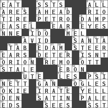 ACROSS 1. Ingest 4. Fast planes 8. Everything 11. Ancient Greek god of war 13. Having the leading position 15. _ de Janeiro 16. Become fatigued 17. Stone: prefix 18. Moist 19. Artist's stand 21. Ewer handle 22. Snake ____ (dice throw) 23. Compass dir. 24. Wedding promise 27. Cartoonist voice _ Blanc 29. Enthusiastic 30. Before Barbara or Clara 34. Keyboard key 36. Dutch treat 39. Guide 40. Hearing organs 41. Prevent from occurring 43. Is not 44. Constellation of myth 46. San ____ (Riviera town) 47. Baseball player Mel 48. Lacking originality or spontaneity 49. Inky black, to poets 51. Shoshoni 53. French article 54. 23rd letter of the Greek alphabet 57. Remaining after all deductions 60. Separate the seeds from cotton 63. Stares 65. Migrant worker of the '30s 66. Feeling or showing extreme anger 69. Shout 70. Lair 71. Smooth fabric 72. Diluted with white 73. Begley and Asner 74. Observes 75. Fast jet (abbr.) DOWN 1. Eroded 2. Believer in; advocate of (suffix) 3. Laconic 4. Plant excrement 5. A female animal or person 6. Wig 7. "Two Mules for Sister ____" 8. Like ___ of sunshine 9. Welles in "The Third Man" 10. Chops off 12. Perceive with the eye 14. Dormintory (informal) 18. Accusation by an informer 20. 54 in ancient Rome 25. Passed on 26. More peculiar 28. Double-curved letter 29. Utter; complete 31. Egg locale 32. Portable shelter 33. Nonscientific branch of learning 34. Small pie 35. Operatic vocal solo 37. Had dinner 38. Klaipeda city 40. Greek goddess of the dawn 42. Loose flowing garment 45. Fish or hair follower 50. Bear (Spanish) 52. The front part of a cuirass 54. Entreaties 55. Exchanges for money 56. Small island 57. Connecting point 58. Made supply last 59. Canisters 61. Ancient river in northeast Turkey 62. Nathan's nickname 64. Con 67. Make a knot 68. Followers of ems