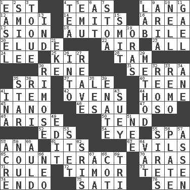 ACROSS 1. Eastern Standard Time (abbr.) 4. Afternoon social gatherings 8. Austrian-born American filmmaker Fritz 12. Mine, in Marseilles 14. Gives off 16. Length times width 17. The Jewish people; Israel 18. Form of transportation 20. Dodge 22. Atmosphere 23. Everything 24. Area sheltered from the wind 25. Apertif with cassis 28. Scottish cap 30. French philosopher Descartes 31. Spanish missionary in California 35. _ Lanka 37. Lie 40. Adolescent 41. Detail 42. Baking chambers 44. Dwelling 45. Billionth: prefix 46. He sold his birthright 47. Bear (Spanish) 48. Originate 50. Watch over 52. Begley and Asner 54. Sight organ 55. Health resort 58. Santa ___, CA 61. It is 63. Vices 65. Neutralize 70. Ancient river in northeast Turkey 71. Governing power 72. The easternmost of the Lesser Sundas 73. False hair 74. Inside; within (prefix) 75. Suttee (variant) 76. Elected rep. DOWN 1. Artist's stand 2. Grin 3. Woman's close-fitting hat 4. Afternoon social gathering 5. Australian flightless bird 6. Small island 7. Portico 8. Experiment locale 9. Operatic vocal solo 10. 1994 drama film starring Jodie Foster 11. Highlander 13. Indiana (abbr.) 15. Stricken, poetically 19. Mouths or openings 21. Supplement with great effort 26. To the inside or interior of 27. Break or tear apart 29. Mode 30. Full of chinks, cracks, or crevices 32. Vintage cars 33. San ____ (Riviera town) 34. A saturated hydrocarbon 35. Play the lead 36. Painter Guido (1575-1642) 38. French article 39. Maternal 41. _ tizzy (2 wds.) 43. Chop _ 49. Prepare for publication 51. Born 53. Proofreading order 55. Fathers 56. Food holder 57. NE Netherlands city 58. 43,560 square feet 59. Part of speech 60. Old (Scot.) 62. Indian titles of respect 64. Large container 66. Modern: prefix 67. Housemaid (var.) 68. Small bed 69. Three (prefix)