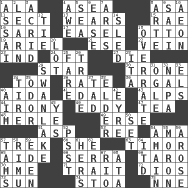 ACROSS 1. In the manner of 4. Toward the sea 8. White ___ sheet 11. Religious group 13. Puts on (as clothing) 15. Actress Charlotte 16. Indian skirt 17. Artist's stand 18. "Beetle Bailey" pooch 19. Satellite of Uranus 21. Compass dir. 22. Distinctive style or manner 23. Indiana (abbr.) 24. Often (poetically) 27. Expire 29. Play the lead 30. Marketplace scale 34. Pull behind 36. Assign a rank or rating to 39. Therefore, facetiously 40. Opera by Verdi 41. Peak District village in England 43. High mountains 44. Literary sarcasm 46. Whirlpool 47. Afternoon social gathering 48. Haggard of country music 49. Celtic language 51. Viper 53. To separate or throw off 54. Wet nurse (var.) 57. Long journey 60. A female animal or person 63. The easternmost of the Lesser Sundas 65. Helper 66. Spanish missionary in California 69. Edible starchy tuberous root 70. Madame (abbr.) 71. Distinguishing feature 72. "Vaya con ____" 73. Player for Phoenix 74. Portico 75. Compass dir. DOWN 1. Slender Brazilian palm 2. Memorize 3. Sour-tasting 4. Deep reverence 5. Ocean 6. Comfort 7. Ancient Greek god of war 8. Johnson of "Laugh-In" 9. Suttee (variant) 10. Age 12. Standoff 14. Downhill vehicle 18. Make much ado about nothing 20. Car dealer's back yard 25. Conductor's collection 26. Swap 28. Call ___ day 29. Tchaikovsky ballet 31. Stare 32. California wine valley 33. Raised railways 34. Become fatigued 35. Scent 37. Small amount or degree 38. A person who is older than you are 40. Direct toward a target or goal 42. Jane of fiction 45. Consenting reply 50. Put into a specified state 52. Inconspicuous attention getter 54. At full speed 55. Person of subnormal intelligence 56. Came up 57. Scottish caps 58. Tall New Zealand timber tree 59. Paradise 61. Possessive pronoun 62. Part of Q.E.F. 64. It would 67. _ de Janeiro 68. _ moment's notice (2 wds.)