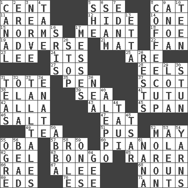 ACROSS 1. Penny 5. Compass dir. 8. Domesticated feline 11. Length times width 12. Flintstone garb 14. Single 15. Typical models 17. Intended 18. Enemy 19. Contrary to your interests or welfare 21. Floor protector 22. Avid follower 23. Area sheltered from the wind 24. ___ a Wonderful Life 25. "We ___ not amused" (Victoria) 27. Mayday 28. Snakelike fish 31. Lug 35. Animal enclosure 37. Native of Scotland 38. Enthusiasm 39. Ocean 41. Ballerina skirt 42. Silent film actress Nazimova 43. Keyboard modifier key 45. Connect, as a bridge 46. Table seasoning 47. Erode 49. Beverage made from leaves 51. Fluid product of inflammation 52. Can I? 55. Chief or king in Benin or Nigeria 57. Sis' sibling 60. Player piano 62. Set 63. Beat drum 65. Less widely known 66. Actress Charlotte 67. Toward shelter 68. Part of speech 69. Begley and Asner 70. Compass dir. 71. Pismires DOWN 1. Lessep's creation 2. Wear away 3. Effrontery 4. Docile 5. A female animal or person 6. Thailand, formerly 7. Pulitzer Prize-winning author Ferber 8. Java holder (2 wds.) 9. Small Philippine buffalo 10. Adolescent 13. Singer James 16. Indian titles of respect 17. Makes clutter 20. Cease 26. Musical pauses 29. Globular water bottle used in Asia 30. Astound 31. Beverages made from leaves 32. Rounded earthenware pot or jar 33. Baron Munchausen's specialties 34. Maternal 36. Teachers' org. 40. City in Syria 44. "Change" in Tahitian 48. Russian ruler of old 50. Swedish rock group 52. Person of subnormal intelligence 53. Native American of Southwest Alaska 54. Entertaining tales 55. Legendary monster 56. Necklace unit 58. Hero or heavy, e.g. 59. Singles 61. Grandmother 64. Unit of force equal to gravity