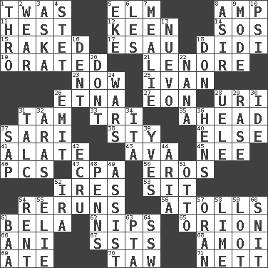 ACROSS 1. It was, poetically 5. Shade tree 8. Electrical Unit 11. Command 12. Peachy ____! 14. Mayday 15. Swept the length of 17. He sold his birthright 18. "You Light Up My Life" star Conn 19. Declaimed 21. Poe poem 23. Immediately 25. _ the terrible 26. Inactive volcano in Sicily 27. Period of immesurable duration 28. RI univ. 31. Scottish cap 33. Three (prefix) 35. At or in the front 37. Indian skirt 38. Filthy place 40. Otherwise 41. Having winglike extensions 43. Actress Gardner 45. Born 46. Personal Computers (abbr.) 47. Numbers guy (abbr.) 50. Greek god of love 52. Angers 53. Be seated 54. Summer TV shows 56. Ringlike coral islands and reefs 61. Actor Lugosi 62. Pinches, bites 65. Greek mythologigal hunter 66. Cuckoo 67. Fast planes 68. Mine, in Marseilles 69. Had dinner 70. The 23rd letter of the Hebrew alphabet 71. Remaining after all deductions DOWN 1. Through, poetically 2. Erode 3. "____ silly question..." 4. Proofreading order 5. Make supply last 6. French article 7. Ear of corn 8. SW Saudi Arabia district 9. Method 10. Air pressure measure (abbr.) 13. New (sp.) 16. Gouge 18. Spanish title 20. Do not 22. Grandmother 24. Armed conflicts 26. Send forth 28. Ubangi River tributary 29. Raze (variant) 30. Binary compound 31. Baby powder 32. Ancient river in northeast Turkey 34. Call ___ day 36. Coop moms 37. Plant excrement 39. Jacques Cousteau's middle name 42. Shade of tan 44. Roberta Peters solo 48. Actor Sean's family 49. Aid 51. "Beetle Bailey" pooch 52. Retirement account (abbr.) 54. Monthly bill 55. Writer Wiesel 57. Northwest Algerian city 58. Welles in "The Third Man" 59. Spoils 60. In a ____ (agitated or irritated) 61. Sound made by sheep 63. Parent Teacher Assoc. 64. Compass dir.