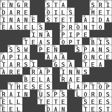 ACROSS 1. Engineer (abbr.) 5. R.R. building 8. _ Lanka 11. Have the gumption 12. Petroleums 14. Was introduced to 15. Silly 17. Proofreading order 18. Opera by Verdi 19. Artist's stands 21. Right away 23. _ tizzy (2 wds.) 25. Corncob 26. Beverages made from leaves 27. Choose 28. Again 31. Compass dir. 33. Writing instrument 35. Connects, as a bridge 37. Capital of Western Samoa 38. Auto club (abbr.) 40. Single time 41. Tarsus (plural) 43. Girls' org. (abbr.) 45. Beverage made from leaves 46. "We ___ not amused" (Victoria) 47. Strike 50. Restaurants 52. Actor Lugosi 53. Actress Charlotte 54. College papers 56. Portable computer 61. Water falling in drops from the sky 62. United States Postal Service (abbr.) 65. Domineers 66. Pipe bend 67. False hair 68. Perceives with the eye 69. Snakelike fish 70. One of the 12 tribes of Israel 71. Trial DOWN 1. Singer Brickell 2. Nanny 3. Pate de foie ____ 4. French philosopher Descartes 5. Distress signal 6. Teat (slang) 7. City in Syria 8. Stricken, poetically 9. Redecorate 10. Call ___ day 13. Remove all contents or possession from 16. Writer Wiesel 18. A saturated hydrocarbon 20. Fastener 22. Elects 24. Toward the sea 26. It was, poetically 28. Object of repulsion 29. South American Indian 30. Compass dir. 31. Practice fight 32. Father 34. Tired old horse 36. Plant holders 37. _ moment's notice (2 wds.) 39. SW Saudi Arabia district 42. Angers 44. Of or related to the anus 48. Eskimo relative 49. Went by 51. Anneal 52. Benjamin's nick name 54. Falsehood 55. Land elevation 57. Mail 58. Woody plant 59. Lyric poems 60. Inconspicuous attention getter 61. Portuguese money of account (variant) 63. Parent Teacher Association (abbr.) 64. Elected rep.