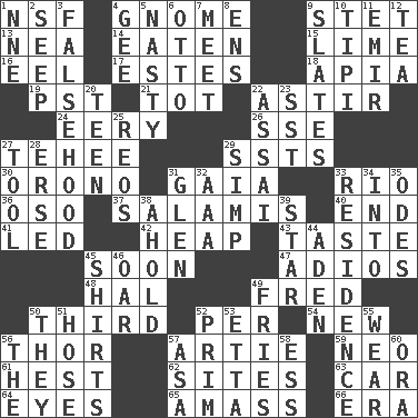 ACROSS 1. Overdraft (abbr.) 4. Dwarf 9. Proofreading order 13. Teachers' org. 14. Consumed 15. Welles in "The Third Man" 16. Snakelike fish 17. _____ Park, CO 18. Capital of Western Samoa 19. Pacific Standard Time (abbr.) 21. Small child 22. Moving about 24. Suggestive of the supernatural 26. Compass dir. 27. Giggle 29. Fast planes 30. U. of Maine site 31. Greek goddess of the earth (variant) 33. _ de Janeiro 36. Bear (Spanish) 37. Deli grouping 40. Conclusion 41. Directed 42. Pile 43. Clothes sense 45. Within a short period 47. Goodbye (Sp.) 48. Actor Linden 49. Flintstone 50. One of three equal parts 52. For each 54. ___ Haven, CT 56. Son of Odin 57. Nick name for Arthur 59. Modern: prefix 61. Behest 62. Locates 63. 4-wheeled motor vehicle 64. Sight organs 65. Collect or gather 66. Epoch DOWN 1. Compass dir. 2. Ooze 3. It jiggles the polygraph 4. Turn to the right 5. Offensive 6. "Beetle Bailey" pooch 7. Confront 8. Followers of ems 9. Chalkboards 10. Native american tent (variation) 11. Independent ruler or chieftain 12. Afternoon social gathering 20. Adolescent 22. Slender Brazilian palm 23. Fast jet (abbr.) 25. Vintage cars 27. Implement 28. Celtic language 29. Simple or foolish person 31. Small, secluded valley 32. American Automobile Association (abbr.) 33. Dwelling 34. To the inside or interior of 35. Lyric poems 38. Hold, grip (Informal) 39. Play the lead 44. An important port of Yemen 45. Upper-body garments 46. Boat paddle 49. Strips of potato fried in deep fat 50. Those people 51. Stockings 52. Demure 53. Singer James 55. Put on (as clothing) 56. Definite Article 57. White ___ sheet 58. Double-curved letter 60. Mouth or opening