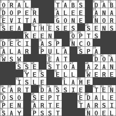 ACROSS 1. Spoken 5. Bar bills 9. Pat or tap gently 12. Drug addict 14. Toward shelter 15. Santa ___, CA 16. Webber/Rice musical 17. Went 18. Or not 19. Ocean 20. College papers 23. Elected reps. 24. Peachy ____! 25. Chooses 27. Tenth: prefix 30. Viper 32. Non-commissioned officer (abbr.) 33. Having or resembling wings 34. Monetary unit of Botswana 36. Health resort 38. Compass dir. 39. Ingest 40. ___ good deed 43. Compass dir. 46. Portico 48. Muslim summons to prayer 49. Affirmative reply 51. Pipe bend 52. Past tense of be (plural) 53. Capri or Wight 54. Unable to walk 56. Draw slowly or heavily 58. Small ungulate mammals of Africa 61. "___ Little Indians" 64. Bear (Spanish) 65. Back-to-school mo. 66. Peak District village in England 68. Fenced enclosure 69. Johnson of "Laugh-In" 70. Tarsus (plural) 71. Declare 72. Inconspicuous attention getter 73. Christmas carol DOWN 1. Lyric poems 2. Be footloose 3. Capital of Western Samoa 4. Allow 5. Labels 6. Medicinal plant 7. Gillaume's butler role 8. Observe 9. Natives or inhabitants of Denmark 10. Soon (poet.) 11. Oblong pieces of solid material 13. Pace 21. Pile 22. Follows as a consequence or result 23. Constrict 24. Apertif with cassis 26. Personal Computers (abbr.) 27. Fool 28. Raised railways 29. Crow sounds 31. Food holder 35. Ringlike coral islands and reefs 37. Edge tool used to cut and shape wood 41. Rowing implement 42. A saturated hydrocarbon 44. System (abbr.) 45. Snakelike fish 47. Jai ____ 48. Deep reverence 50. Spring feasts 53. Literary sarcasm 55. Rendezvous 56. 911 reaches them 57. At sea 59. Tenement units (abbr.) 60. Proofreading order 61. Pacific island yam 62. Otherwise 63. Famous astronaut Armstrong 65. Plant excrement 67. Daniel's nick name