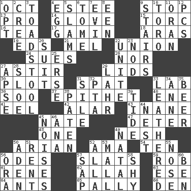 ACROSS 1. Sep. follower 4. First name in cosmetics 9. Constrict 13. Adept person 14. Michael Jackson trademark 15. Torque (variant) 16. Beverage made from leaves 17. Homeless child 18. Ancient river in northeast Turkey 19. Begley and Asner 21. Cartoonist voice _ Blanc 22. The state of being joined or united 24. Takes to court 26. Or not 27. Moving about 29. Flaplike coverings 30. Ground plans 31. Argument over a trivial matter 33. Experiment locale 36. "Barney Miller" actor Jack 37. Curse 40. Compass dir. 41. Snakelike fish 42. Having or resembling wings 43. Empty; void 45. Nathan's nickname 47. Prevent from occurring 48. Single 49. Tender 50. Believer in; advocate of (suffix) 52. Nursemaid (var.) 54. Nine, plus one 56. Lyric poems 57. Narrow boards 59. Director Reiner 61. French philosopher Descartes 62. Assad's deity 63. Compass dir. 64. Pismires 65. Chummy 66. Lair DOWN 1. Elect 2. Algonquian 3. Inedible or poisonous agaric 4. Ovum 5. Shuts with force 6. Heavy book 7. Tending to cause great harm 8. Car or cant ending 9. Flight of steps 10. "Corrida" creature 11. NW Algerian seaport 12. Personal Computers (abbr.) 20. Set of matching outer garments 22. Join together 23. Dreamland 25. Celtic language 27. Domed church section 28. _ gin 29. Cowardly lion portrayer 31. Filth; sediment 32. Parent Teacher Association (abbr.) 33. Tough but pliablecoriaceous 34. Queen of England 1702-14 35. Fermented drink made from hops 38. Eucharist need 39. Event that recurs at intervals 44. A home for chicks 45. Annoying sounds 46. Santa ___, CA 49. Brizilian seaport 50. Arabian gulf 51. Monthly bill 52. Silent film actress Nazimova 53. Promenade 55. Sense of smell 56. Mouth or opening 57. Plant excrement 58. Like a shrinking violet 60. Benjamin's nick name