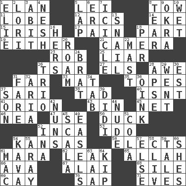 ACROSS 1. Style 5. Luau accessory 8. Pull behind 11. Ear part 12. Curves 14. Supplement with great effort 15. From or relating to Ireland 17. Ache 18. Role in a play 19. One or the other of two 21. Device for capturing images 23. Director Reiner 25. One who doesn't tell the truth 26. Russian ruler of old 27. Raised railways 28. Deep reverence 31. At a great distance 33. Floor protector 35. Drinks excessively 37. Indian skirt 38. Bit 40. Is not 41. Greek mythologigal hunter 43. Storage container 45. Fish or hair follower 46. Teachers' org. 47. Purpose 50. Evade 52. South American Indian 53. Wedding promise 54. Sunflower state 56. Chooses 61. Hindu Mythology: god of death 62. Path through which fluid escapes 65. Assad's deity 66. Actress Gardner 67. Jai ____ 68. Drop; flow; fall 69. Island 70. Plant excrement 71. Nights before holidays DOWN 1. Writer Wiesel 2. Australian parrot (variant) 3. "This won't hurt ____!" 4. Soft 5. Pet locale 6. Period 7. Hanging ice 8. Lacerate 9. Gumbo ingredient 10. Soggy 13. Slow-paced one 16. Possessive pronoun 18. For each 20. Wander aimlessly 22. Vertical spar for supporting sails 24. Naughty child 26. Musical group of three 28. Domed church section 29. Gone 30. Eastern Standard Time (abbr.) 31. Conductor's collection 32. Roberta Peters solo 34. Keyboard key 36. Pig sound 37. Manchild 39. "You Light Up My Life" star Conn 42. Religious women 44. Unadorned 48. Any of the three canals of the cochlea 49. Artist's stands 51. Root beer relative 52. _ tizzy (2 wds.) 54. Polynesian shrub of the pepper family 55. Like ___ of sunshine 57. Otherwise 58. 154 in Roman numerals 59. Story 60. "______ My Girl" (Turtles hit) 61. Big _ 63. Auto club (abbr.) 64. Sleep