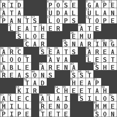 ACROSS 1. To free from 4. Introduce or present, as a question 8. Stare wonderingly 12. "One Day ___ Time" 13. Hereditary estate 14. ____ Bator, Mongolia 15. Leg coverings 18. Chops off 19. Drink excessively 20. Cordwainer's material 22. Had dinner 23. _ gin 24. Australian flightless bird 25. Automobile 26. Catching in a trap 30. Curve 33. Theater features 36. Length times width 37. Spoils 39. Actress Gardner 40. For fear that 41. Competent 42. Sports stadium 44. A female animal or person 45. Thinks logically 47. Fast jet (abbr.) 50. Small boy 51. Pile 53. Apertif with cassis 54. Leopard's kin 57. Actor Baldwin 59. Jai ____ 61. Grain storage towers 63. Place where flour is made 64. Tear apart 65. Madame (abbr.) 66. Corncob 67. Wig 68. Manchild DOWN 1. Hit sharply and swiftly 2. Slanted text style (abbr.) 3. Natives or inhabitants of Denmark 4. Whine 5. Scent 6. Plant excrement 7. Raised railways 8. From the throat 9. _ vera 10. Infant food 11. Compass dir. 16. Baby powder 17. Portico 21. Possessive pronoun 22. Nursemaid (var.) 24. Followers of ems 26. Comedian Laurel of Laurel & Hardy 27. Angers 28. Delicate 29. Yard entry 30. Having or resembling wings 31. Loose flowing garment 32. Root beer relative 34. Hearing organs 35. "___ Maria" 38. One of the two male reproductive glands 42. Also 43. American tennis player Robert 46. Rowing implement 48. Observes 49. Jacques of French films 52. Insides of hands 53. Seaweed 54. Patter 55. Flintstone garb 56. Like (prefix) 57. Electrical Unit 58. Cards in a Roman deck? 59. Tate display 60. Area sheltered from the wind 62. Elected rep.