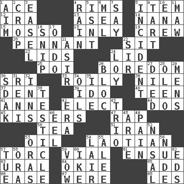 ACROSS 1. Adept person 4. Basketball hoops 8. A whole individual unit 12. Lyricist Gershwin 13. At sea 14. Grandmother 15. With motion or animation 18. In an inward manner 19. Group working together 20. Pre-World Series prize 22. Be seated 23. Hats (slang) 24. Flaplike covering 25. Luau course 26. Mood resulting from idleness 30. Indian title of respect (Mr.) 33. Agitated, as a liquid 36. Mediterranean tributary 37. Incision 39. Wedding promise 40. Adolescent 41. Queen of England 1702-14 42. Opt 44. Two (Sp.) 45. Smoochers 47. Reproach for some lapse or misdeed 50. Beverage made from leaves 51. SW Asia republic 53. Petroleum 54. Of or relating to Laos or its people 57. Torque (variant) 59. Small bottle 61. Follow as a consequence or result 63. Mountain range 64. Migrant worker of the '30s 65. Say or write further 66. Comfort 67. Past tense of be (plural) 68. French article DOWN 1. Direct toward a target or goal 2. Riding implement 3. Artist's stand 4. Precipitation 5. Is not 6. Cartoonist voice _ Blanc 7. Declare 8. Happening 9. Small pie 10. Compass dir. 11. Opening into something insatiable 16. Clip 17. Southwest Nigerian state 21. SW Saudi Arabia district 22. Title for a knight 24. Myrna of the movies 26. Alliance 27. Passed on 28. Butter sub 29. Not women's 30. Neighbor of Neb. 31. Painter Guido (1575-1642) 32. Lodging establishments 34. Petroleums 35. Binary compound 38. A testis 42. Period 43. Musical group of three 46. Snakelike fish 48. Johnson of "Laugh-In" 49. Ache 52. Relating to the nose 53. Mouths or openings 54. Den 55. Toward shelter 56. Naked 57. Third day of the wk. 58. Mouth or opening 59. Promise 60. Mamie's husband 62. Begley and Asner