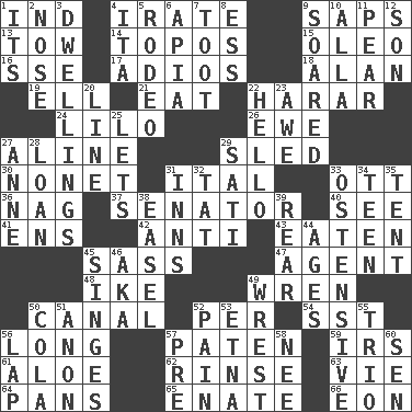 ACROSS 1. Indiana (abbr.) 4. Feeling or showing extreme anger 9. Plant excrements 13. Pull behind 14. Traditional theme or motif 15. Margarine 16. Compass dir. 17. Goodbye (Sp.) 18. ____ Jay Lerner 19. Pipe bend 21. Erode 22. Ethiopian city, capital of Harari 24. _ and Stitch 26. She-sheep 27. Place in a line 29. Downhill vehicle 30. Music written for nine 31. Slanted text style (abbr.) 33. Baseball player Mel 36. Tired old horse 37. Legislator 40. Observe 41. Followers of ems 42. Against 43. Consumed 45. Backtalk 47. Rep 48. Mamie's mate 49. Songbird 50. Lessep's creation 52. For each 54. Fast jet (abbr.) 56. Having great length 57. Eucharist need 59. Big collection agency 61. _ vera 62. Wash lightly 63. Compete 64. Zero-star reviews 65. Related on the mother's side 66. Period of immesurable duration DOWN 1. It is 2. Sense of smell 3. Residences 4. Call ___ day 5. Cowboy competition 6. Capital of Western Samoa 7. A blast of a horn 8. Curvy letter 9. Flew 10. Silent film actress Nazimova 11. Lightbulb-shaped fruit 12. Male child 20. Actor's bit 22. Phone greeting 23. Deep reverence 25. Allows 27. Singer Murray 28. Grant temporary use of 29. Suttee (variant) 31. Restaurants 32. Make lace 33. Clearly or manifestly demonstrative 34. Adolescent 35. Portable shelter 38. Artist's stand 39. Bring up, as a child 44. Matures 45. Burns superficially 46. Alias (abbr.) 49. Obtain by seizing forcibly or violently 50. Root beer relative 51. Soon (poet.) 52. Ache 53. Inactive volcano in Sicily 55. Musical group of three 56. Infant locale 57. Before (prefix) 58. Born 60. Elected rep.