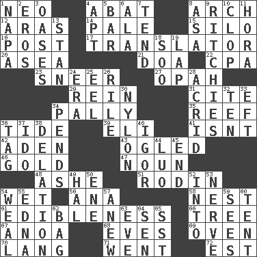 ACROSS 1. Modern: prefix 4. Blind as ____ 8. Bowlike part 12. Caspian sea tributary 14. Light colored 15. Grain storage tower 16. Mail 17. Interpreter 20. At sea 21. ___ good deed 22. Tax preparer (abbr.) 23. Contemptuous expression 27. Brightly colored fish 29. It's straight from the horse's mouth 31. Quote 34. Chummy 35. Coral ridge 36. Periodic rise and fall of the sea level 39. Connecticut Ivy Leaguer 41. Is not 42. An important port of Yemen 43. Stared 46. Gilded 47. Part of speech 48. American tennis player Robert 51. "The Thinker" sculptor 54. Soggy 56. Santa ___, CA 58. A home for chicks 61. The property of being fit to eat 66. Relationship diagram 67. Small Philippine buffalo 68. Nights before holidays 69. Baking chamber 70. Long (Scottish) 71. Left 72. Eastern Standard Time (abbr.) DOWN 1. California wine valley 2. Greek god of love 3. Fertile tracts in a desert 4. Fitting 5. Long, evenly shaped piece 6. Insect wing 7. Look after 8. White ___ sheet 9. Actors Guy, Robert Welles, and Clint 10. Hoof sound 11. Israeli folk dance 13. Comedian Laurel of Laurel & Hardy 18. "Barney Miller" actor Jack 19. Infant locale 24. Period 25. Snakelike fish 26. Cause heat under the collar 28. Sour-tasting 30. Thermoplastic polyamide 32. Nine, plus one 33. Newt 34. Hangs 36. Label 37. Wedding promise 38. Accusation by an informer 40. Composer Stravinsky 44. Nilotic language 45. Conclude 49. Actor Linden 50. Compass dir. 52. To the inside or interior of 53. Boldness 54. Welt 55. Pulitzer Prize-winning author Ferber 57. Afresh 59. Observes 60. Portable shelter 62. Paper or plastic container 63. First lady 64. Elected rep. 65. Fast jet (abbr.)