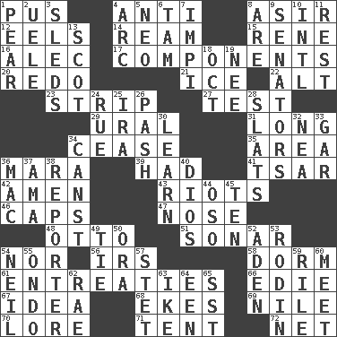 ACROSS 1. Purulenc 4. Against 8. SW Saudi Arabia district 12. Snakelike fish 14. 480, 500 or 516 sheets of paper 15. French philosopher Descartes 16. Actor Baldwin 17. Parts 20. Make new 21. Frozen water 22. The first octave above the treble staff 23. Long narrow piece of something 27. Trial 29. Mountain range 31. Having great length 34. Desist 35. Type of rug 36. Hindu Mythology: god of death 39. Possessed 41. Russian ruler of old 42. So be it 43. Disturbances 46. Smile enhancers 47. Olfactory organ 48. Von Bismarck 51. Underwater navigation system 54. Not either 56. Big collection agency 58. Dormintory (informal) 61. Pleas 66. Singer Brickell 67. The content of cognition 68. Supplements with great effort 69. "Death on the ____" 70. Old wives' tales, e.g. 71. Portable shelter 72. Fish or hair follower DOWN 1. Lightbulb-shaped fruit 2. Ubangi River tributary 3. Bobsleighs 4. Curve 5. Modern: prefix 6. Scottish cap 7. Body of Kaffir warriors 8. "We ___ not amused" (Victoria) 9. Elected representatives 10. International (abbr.) 11. Take ten 13. Native of Scotland 18. Sep. follower 19. Born 24. Regret 25. Retirement account (abbr.) 26. Romantic infatuation 28. Narrow boards 30. Acquire or gain knowledge or skills 32. Teachers' org. 33. Slender fish 34. 2nd pers. sing. pres. of can (arch.) 36. Apple computer (short form) 37. Housemaid (var.) 38. News announcer 40. "Vaya con ____" 44. Bear (Spanish) 45. "___ Little Indians" 49. Standoff 50. Mouth or opening 52. Arabian gulf 53. "The Thinker" sculptor 54. Famous astronaut Armstrong 55. Southwest Nigerian state 57. Proofreading order 59. Cause heat under the collar 60. Rendezvous 62. Actress Charlotte 63. Mamie's mate 64. Car or cant ending 65. Fast jet (abbr.)