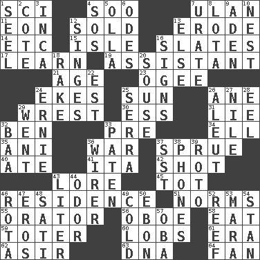 ACROSS 1. _-fi 4. "Barney Miller" actor Jack 7. ____ Bator, Mongolia 11. A really long time 12. Disposed of to a purchaser 13. Wear away 14. And so on (abbr.) 15. Small island 16. Chalkboards 17. Memorize 19. Helper 21. Mature 23. Double curve, resembling the letter S 24. Makes supply last 25. Player for Phoenix 26. A saturated hydrocarbon 29. Obtain by seizing forcibly or violently 30. Curvy letter 31. Untruth 32. Benjamin's nick name 33. Before (prefix) 34. Pipe bend 35. Cuckoo 36. Armed conflict 37. Disorder 40. Had dinner 41. Call ___ day 42. Guess 43. Old wives' tales, e.g. 45. Small child 46. Dwelling 51. Typical models 55. Speaker 56. Mitch Miller's instrument 58. Consume 59. Carrier 60. Tennis shots 61. Period 62. SW Saudi Arabia district 63. Heredity factor (abbr.) 64. Air blower DOWN 1. Sew up the eyelids of hawks and falcons 2. ____ d'Azur (French Riviera) 3. South American Indian 4. Mayday 5. Water jar 6. Lyric poems 7. A salt of uric acid 8. Globular water bottle used in Asia 9. Arabian gulf 10. Egg locale 12. Scorches 13. Otherwise 16. Signals 18. Immoral or dissolute person 20. Boozer 22. Eastern Standard Time (abbr.) 24. Bert's buddy 25. Spanish missionary in California 26. Native American of Southwest Alaska 27. The longest river in the world 28. Snakelike fish 29. Left 32. Sound made by sheep 33. Eucharist need 36. One who wires 37. Fast jet (abbr.) 38. Gives a jingle 39. Printing process, for short 43. 61 cubic inches 44. Aroma 46. Roll call or roster of names 47. Greek god of love 48. Suttee (variant) 49. Having a low temperature 50. Inky black, to poets 52. Coral collection 53. Hindu Mythology: god of death 54. Comedian Laurel of Laurel & Hardy 57. Chief or king in Benin or Nigeria