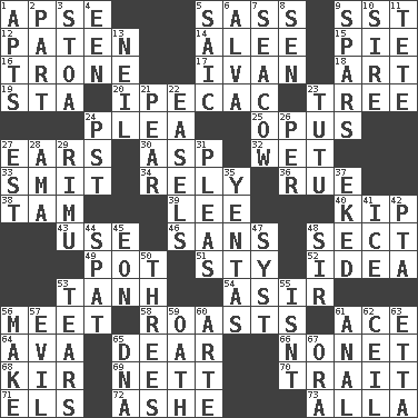 ACROSS 1. Domed church section 5. Backtalk 9. Fast jet (abbr.) 12. Eucharist need 14. Toward shelter 15. Sliced dessert 16. Heavy duty weighing machine 17. _ the terrible 18. Tate display 19. R.R. building 20. Medicinal drug used to evoke vomiting 23. Relationship diagram 24. Entreaty 25. Musical composition 27. Hearing organs 30. Cleo's killer 32. Dripping 33. Stricken, poetically 34. Trust 36. Sorrow 38. Scottish cap 39. Area sheltered from the wind 40. Monetary unit of Laos 43. Purpose 46. Without 48. Religious group 49. Plant holder 51. Filthy place 52. It may be bright or harebrained 53. Hyperbolic tangent 54. SW Saudi Arabia district 56. Confront 58. Exposes to great heat 61. Adept person 64. Actress Gardner 65. Letter starter 66. Music written for nine 68. Apertif with cassis 69. Remaining after all deductions 70. Distinguishing feature 71. Raised railways 72. American tennis player Robert 73. Silent film actress Nazimova DOWN 1. Flats, for short 2. Role in a play 3. Portico 4. Car or cant ending 5. Ketch in the Levant 6. Inventor's middle name 7. Manatee 8. Elected rep. 9. Practice fights 10. Beget 11. Wig 13. Famous astronaut Armstrong 21. Lightbulb-shaped fruit 22. Artist's stands 23. Ballerina skirt 24. Pacific Standard Time (abbr.) 26. For each 27. Eastern Standard Time (abbr.) 28. Housemaid (var.) 29. Tall New Zealand timber tree 31. Entreaties 35. Gossips 37. Supplemented with great effort 41. Frozen water 42. Parent Teacher Assoc. 44. Petty quarrel 45. A really long time 47. System (abbr.) 48. Title for a knight 50. Triads 53. Separates forcefully 55. Is not 56. Cause to be 57. Morally bad or wrong 59. Pledge 60. Johnson of "Laugh-In" 61. Of or related to the anus 62. To provide with a ceiling 63. Singer James 65. Heredity factor (abbr.) 67. Mouth or opening