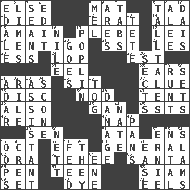 ACROSS 1. Otherwise 5. Floor protector 8. Small amount or degree 11. Passed on 12. Part of Q.E.F. 14. Chicken ___ king 15. With great haste 17. Cadet 18. Luau accessory 19. Small, flat, pigmented spot on the skin 21. Fast jet (abbr.) 22. French article 23. Curvy letter 24. Trim (branches) 25. Eastern Standard Time (abbr.) 27. Snakelike fish 28. Hearing organs 31. Caspian sea tributary 35. Be seated 37. A slight indication 38. Compact _ 39. Lower and raise head in agreement 41. Portable shelter 42. In addition 43. Separate the seeds from cotton 45. Fast planes 46. It's straight from the horse's mouth 47. Atlas unit 49. Elected rep. 51. _ moment's notice (2 wds.) 52. Followers of ems 55. Sep. follower 57. Newt 60. Commissioned military rank 62. Mouth or opening 63. Giggle 65. Before Barbara or Clara 66. Fenced enclosure 67. Adolescent 68. Thailand, formerly 69. Arrange properly for use 70. Color 71. Snakelike fish DOWN 1. Peak District village in England 2. Citrus fruits 3. Actors Connery and Penn 4. Prepare for publication 5. Cartoonist voice _ Blanc 6. Ancient Greek god of war 7. Bar bills 8. Baron Munchausen's specialties 9. Toward shelter 10. Raised platform 13. False hair 16. The longest river in the world 17. Cotton for raincoats, e.g. 20. Leaves 26. Religious groups 29. Undersized animal 30. Arranges properly for use 31. The sixth month of the Jewish calendar 32. Cause heat under the collar 33. Aide 34. Biscuitlike quick bread 36. Coat; cloak 40. Break 44. Nathan's nickname 48. Baking dishes 50. Remaining after all deductions 52. Bert's buddy 53. Brizilian seaport 54. Shuts with force 55. I made a mistake 56. Algonquian 58. Nourish 59. Those things 61. Comfort 64. Compass dir.