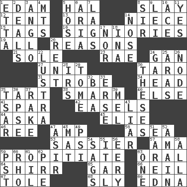 ACROSS 1. Dutch treat 5. Actor Linden 8. Kill 12. Portable shelter 13. Mouth or opening 14. Sibling's daughter 15. Labels 16. Seigniories (variant) 19. 100% 20. Thinks logically 21. Flatfish 23. Actress Charlotte 24. Separate the seeds from cotton 27. A single undivided whole 30. Edible starchy tuberous root 31. Disco prop 34. Froth on beer 35. Small pie 38. Excessive but superficial compliments 40. Otherwise 41. Coast Guard woman 42. Artist's stands 44. "____ silly question..." 45. Writer Wiesel 46. Portuguese money of account (variant) 47. Electrical Unit 50. Toward the sea 53. More disrespectful 57. Wet nurse (var.) 59. Conciliate 63. Spoken 64. Bake eggs in their shells 65. Slender fish 66. Famous astronaut Armstrong 67. Lacquered or enameled metalware 68. Insidious 69. Pulitzer Prize-winning author Ferber DOWN 1. Singer James 2. Allots cards 3. White American of non-Hispanic descent 4. Mountains (abbr.) 5. Stockings 6. Roberta Peters solo 7. Straggles 8. Title for a knight 9. Luau accessory 10. Adept person 11. It is so 14. Sense of smell 17. And not 18. _ tizzy (2 wds.) 20. Monthly bill 22. A period of five years 24. Highlander 25. Ancient river in northeast Turkey 26. Connecting point 28. Big collection agency 29. Heavy book 30. College papers 32. Sound made by sheep 33. Celtic language 35. Russian ruler of old 36. Domed church section 37. Libertine 39. Cartoonist voice _ Blanc 43. One who doesn't tell the truth 47. SW Saudi Arabia district 48. Floor protector 49. Air pressure measure (abbr.) 51. Having ears or earlike features 52. At full speed 54. Settles 55. Slanted text style (abbr.) 56. Suggestive of the supernatural 58. Silent film actress Nazimova 59. Pacific Standard Time (abbr.) 60. 17th letter of the Greek alphabet 61. Lubricate 62. Before (prefix) 63. Single