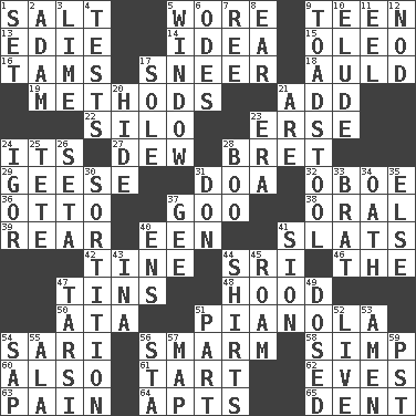 ACROSS 1. Table seasoning 5. Had on 9. Adolescent 13. Singer Brickell 14. The content of cognition 15. Butter sub 16. Scottish caps 17. Scornful expression 18. Old (Scot.) 19. Modes 21. Say or write further 22. Grain storage tower 23. Celtic language 24. It is 27. Morning condensation 28. Cy Young winner Saberhagen 29. Honkers 31. ___ good deed 32. Mitch Miller's instrument 36. "Beetle Bailey" pooch 37. Thick or sticky substance 38. Of the mouth 39. Buttocks 40. Car or cant ending 41. Narrow boards 42. Prong on a fork 44. Indian title of respect (Mr.) 46. Definite Article 47. Metal containers 48. Parka part 50. _ moment's notice (2 wds.) 51. Player piano 54. Indian skirt 56. Excessive but superficial compliments 58. Simple or foolish person 60. In addition 61. Small pie 62. Nights before holidays 63. Ache 64. Tenement units (abbr.) 65. Gouge DOWN 1. Put into a specified state 2. First of billions? 3. Welles in "The Third Man" 4. Trials 5. Light entry point 6. Lyric poems 7. To riddle 8. Ewer handle 9. Inedible or poisonous agaric 10. Dodge 11. Snakelike fish 12. Allow head to fall sleepily 17. Not divided or shared with others 20. Flintstone garb 21. "We ___ not amused" (Victoria) 23. Epoch 24. Russian composer Stravinsky 25. Wig 26. Stalk of a moss capsule 28. Oct. 31 cry 30. Drawing lots 31. Spanish title 33. Naughty child 34. Pledge 35. Otherwise 37. Turn to the right 40. Followers of ems 41. The Jewish people; Israel 43. _ tizzy (2 wds.) 44. Upper-body garments 45. Wander aimlessly 47. Tarsus (plural) 49. Administered medicine 51. Role in a play 52. Not recorded 53. So be it 54. Plant excrement 55. Insect wing 56. R.R. building 57. Atlas unit 59. Pacific Standard Time (abbr.)