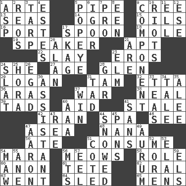 ACROSS 1. Johnson of "Laugh-In" 5. Corncob 9. Algonquian 13. Oceans 14. Legendary monster 15. Petroleums 16. Sweet dark-red dessert wine 17. Soup utensil 18. Undercover agent 19. Orator 21. Fitting 22. Kill 23. Greek god of love 24. A female animal or person 27. Personal question 28. Small, secluded valley 29. Utah city north of Ogden 31. Scottish cap 32. Singer James 36. Ancient river in northeast Turkey 37. Armed conflict 38. Be tempered by heat 39. Small amounts or degrees 40. Help 41. Showing deterioration from age 42. SW Asia republic 44. Health resort 46. Perceive with the eye 47. Toward the sea 48. Grandmother 50. Had dinner 51. Eat 54. Hindu Mythology: god of death 56. Catcalls? 58. Hero or heavy, e.g. 60. At once, immediately (arch.) 61. False hair 62. Mountain range 63. Left 64. Downhill vehicle 65. Not women's DOWN 1. Viper 2. Vintage cars 3. Canvas cover 4. _____ Park, CO 5. Wimpy's pal 6. Composer Stravinsky 7. Adept person 8. Car or cant ending 9. Part 10. Disturbances 11. Pipe bend 12. Compass dir. 17. Heroin 20. ____ Jay Lerner 21. "We ___ not amused" (Victoria) 23. Shade tree 24. Narrow board 25. Israeli folk dance 26. Mild oath 28. Slender fish 30. Helper 31. Small boy 33. Beverages made from leaves 34. Falsehood 35. Toward shelter 37. Acquire through effort 40. American Automobile Association (abbr.) 41. Without 43. To separate or throw off 44. Overwhelmed 45. Zero-star reviews 47. Composer Copland 49. Gold (Symbol: Au) 51. ____ d'Azur (French Riviera) 52. Greater amount 53. Flair 54. Informal term for the mouth 55. One (Scot) 56. Mountains (abbr.) 57. Snakelike fish 59. Raised railways