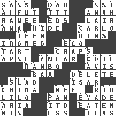 ACROSS 1. Backtalk 5. Small moist lump or mass 8. Fast jet (abbr.) 11. Eskimo relative 13. One more than two 14. Housemaid 15. Indian princess (variant) 16. Begley and Asner 17. Den 18. Santa ___, CA 19. Flintstone garb 21. Monte _, Las Vegas Hotel/Casino 22. Adolescent 24. Basketball hoops 25. Pressed 27. Environmental prefix 29. Small pie 30. Dice game 32. Domed church section 33. Approach 35. ____ d'Azur (French Riviera) 39. Role for Stallone 41. Deliberation 42. Sound made by sheep 43. Erase 45. Broad, flat, thick piece 48. Austrian river, tributary to the Danube 49. Large country 50. Confront 52. To free from 55. _ and Stitch 56. Baking dish 57. Dodge 59. Operatic vocal solo 60. It would 61. Eroded 62. Mountains (abbr.) 63. Curvy letter 64. Afternoon social gatherings DOWN 1. "Two Mules for Sister ____" 2. Actor Alda or Thicke 3. Elected representatives 4. Institute legal proceedings 5. Passed on 6. Assistant 7. Again 8. Excessive but superficial compliments 9. Moves on water 10. Through, poetically 12. Giggle 14. Jai _ 20. Indiana (abbr.) 21. Riding implement 23. Keyboard key 25. Call ___ day 26. Hit sharply and swiftly 27. Period 28. 4-wheeled motor vehicle 30. Corporate head (abbr.) 31. Any of the three canals of the cochlea 33. Nanny (var.) 34. Basketball assoc. 36. Make much ado about nothing 37. Teat (slang) 38. Compass dir. 40. Swedish rock group 43. Expire 44. First name in cosmetics 45. Chest covering 46. Ms. Damita and namesakes 47. Small Philippine buffalo 49. Burrowing marine mollusk 50. Floor protectors 51. Conclusions 53. It may be bright or harebrained 54. Hiding places for outlaws 56. Sliced dessert 58. Large container