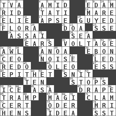 ACROSS 1. Federal power corp. 4. Among 8. Dutch treat 12. To free from 13. Jacques of French films 14. Female horse 15. Writer Wiesel 17. Domed church section 18. Secured 19. Plants 21. ___ good deed 23. Compass dir. 24. Slender Brazilian palm 26. Ocean 28. Hearing organs 30. Electrical Measurement 34. Leather borer 37. Small Philippine buffalo 39. Inky black, to poets 40. Corporate head (abbr.) 41. Annoying sound 43. Directed 44. Redecorate 46. Butter sub 47. Double-curved letter 48. Curse 51. In a ____ (agitated or irritated) 54. Nine, plus one 55. Ceases 58. Frozen water 61. White ___ sheet 63. Window treatment 65. _____ steamer (cargo ship) 67. Wise men 71. Dollar (slang) 72. Foregone conclusion 73. Baltic tributary 74. Medical imaging device (abbr.) 75. Coop moms 76. It may be bright or harebrained 77. Fast jet (abbr.) DOWN 1. Unclean, religiously 2. Country residence 3. Goodbye (Sp.) 4. _ moment's notice (2 wds.) 5. Atlas unit 6. ___ a Wonderful Life 7. Passed on 8. Australian flightless bird 9. 24-hour periods 10. Ancient Greek god of war 11. Ancient Persian 16. Celtic language 18. Highlander 20. Auto club (abbr.) 22. Bear (Spanish) 25. SW Asia republic 27. Had dinner 29. Snout, nose 30. Flower holders 31. Competent 32. Moves 33. Conclusions 34. 1/640 square mile 35. Shed a tear 36. Farming town in central California 38. Lubricate 42. Immeasurably long periods of time 45. Baseball player Mel 49. Pile 50. Followers of ems 52. It would 53. Torque (variant) 56. Insides of hands 57. Practice fights 58. Hankering 59. Algonquian 60. Merit 62. Mine, in Marseilles 64. Give off 66. Mountains (abbr.) 68. Increase 69. Turn to the right 70. Lyricist Gershwin