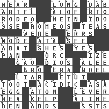 ACROSS 1. Put on (as clothing) 5. Yearn 9. Apply (a substance) by light strokes 12. Satellite of Uranus 14. _ vera 15. River (Sp.) 16. Cowboy competition 17. Chow _ 18. Wedding promise 19. Compass dir. 20. Lover boys 23. Afternoon social gatherings 24. We are 25. Blunders 27. Method 30. _ moment's notice (2 wds.) 32. Observe 33. Blind as ____ 34. "______ My Girl" (Turtles hit) 36. It is so 38. Baking dish 39. The grampus (Milton) 40. Ending with capital 43. E Mali city 46. "Vaya con ____" 48. Toward shelter 49. Sis' sibling 51. Period 52. Christmas carol 53. One who doesn't tell the truth 54. Needle holder 56. A blast of a horn 58. Being or containing an acid 61. White ___ sheet 64. Oval reproductive body of a fowl 65. Smallest unit of an element 66. Crowbar 68. Teachers' org. 69. Seaweed 70. Place in a line 71. Lair 72. Sums up 73. Fast planes DOWN 1. Armed conflicts 2. Greek god of love 3. Assistant 4. Portuguese money of account (variant) 5. Unable to walk 6. Margarine 7. Annoying sounds 8. Commissioned mil. rank 9. Frees from moisture 10. Opera by Verdi 11. Expressions of contempt or scorn 13. Old wives' tales, e.g. 21. Mouths or openings 22. Mode 23. Woody plant 24. Dripping 26. Marina Del _, California 27. Atlas unit 28. Chief or king in Benin or Nigeria 29. Mild oath, euphamism for damn 31. Nest on high 35. Tallied 37. Grain storage tower 41. Last letter of the English alphabet 42. Snakelike fish 44. "This won't hurt ____!" 45. Mouth or opening 47. Suttee (variant) 48. Cuckoo 50. Spoke pompously 53. Utah city north of Ogden 55. Southern CA. univ. 56. Look after 57. Double curve, resembling the letter S 59. Having a low temperature 60. Naughty children 61. Opinion 62. Transmitted 63. Ancient Greek god of war 65. Alias (abbr.) 67. Raised railways