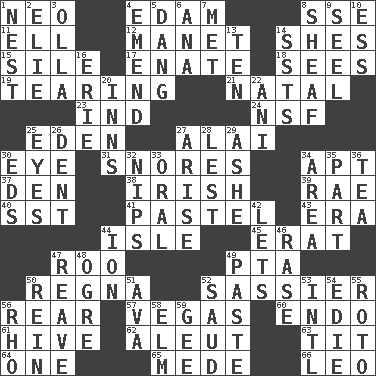 ACROSS 1. Modern: prefix 4. Dutch treat 8. Compass dir. 11. Pipe bend 12. French painter Edouard 14. "______ My Girl" (Turtles hit) 15. Drop; flow; fall 17. Related on the mother's side 18. Perceives with the eye 19. Pulling apart 21. Relating to or accompanying birth 23. Indiana (abbr.) 24. Overdraft (abbr.) 25. Genesis locale 27. Jai _ 30. Sight organ 31. Sounds asleep 34. Fitting 37. Lair 38. From or relating to Ireland 39. Actress Charlotte 40. Fast jet (abbr.) 41. Soft color 43. Period 44. Small island 45. Part of Q.E.F. 47. Friend of Pooh 49. Parent Teacher Association (abbr.) 50. Rain (Swedish) 52. More disrespectful 56. Rump 57. Viva Las _ 60. Inside; within (prefix) 61. Hub of activity 62. Eskimo relative 63. Teat (slang) 64. Single 65. Ancient Persian 66. Lion DOWN 1. Egg locale 2. Writer Wiesel 3. Spanish pot 4. Make improvements or corrections to 5. Mild oath, euphamism for damn 6. Santa ___, CA 7. Was introduced to 8. Archer's quiver 9. Sew up the eyelids of hawks and falcons 10. Curvy letter 13. Nine, plus one 14. Fast planes 16. One of the Great Lakes 20. Restaurants 22. Black tropical American cuckoo 25. Snake ____ (dice throw) 26. Gouge 27. Ascend 28. For fear that 29. American tennis player Robert 30. Begley and Asner 32. Pinches, bites 33. Spoken 34. Length times width 35. Component 36. Beverage made from leaves 42. Allows 44. Electrically charged atom 46. Raze (variant) 47. Rob, plunder, or pillage 48. Legendary monster 49. Thick mixture 50. It's straight from the horse's mouth 51. Actress Gardner 52. Saudi Arabian king (1953-1964) 53. International (abbr.) 54. Singer Brickell 55. Printing process, for short 56. 17th letter of the Greek alphabet 58. Shade tree 59. Unit of force equal to gravity
