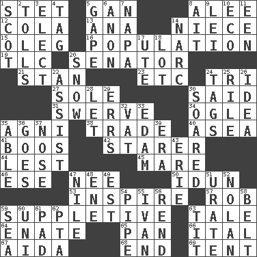ACROSS 1. Proofreading order 5. Separate the seeds from cotton 8. Toward shelter 12. Root beer relative 13. Santa ___, CA 14. Sibling's daughter 15. Cassini of fashion 16. Census information 19. Affectionate concern, for short 20. Legislator 21. Comedian Laurel of Laurel & Hardy 23. And so on (abbr.) 24. Three (prefix) 27. Not divided or shared with others 30. Stated 31. Turn aside suddenly 34. Stare at amorously 35. Hindu god of fire 38. Swap 40. At sea 41. Scornful sounds 42. A viewer who gazes fixedly 44. For fear that 45. Female horse 46. Compass dir. 47. Born 50. Goddess of spring and wife of Bragi 53. Motivate 57. Director Reiner 59. Supplementary 63. Story 64. Maternal 65. Baking dish 66. Slanted text style (abbr.) 67. Opera by Verdi 68. Conclude 69. Portable shelter DOWN 1. Native of Scotland 2. For Whom the Bell _____ 3. Opt 4. Label 5. Stare wonderingly 6. At once, immediately (arch.) 7. California wine valley 8. Small island 9. Flowery wreath 10. Environmental prefix 11. Car or cant ending 14. Drug cop 17. Shoshoni 18. Car dealer's back yard 20. Overwhelm 22. Help 24. Labels 25. Cause heat under the collar 26. The content of cognition 28. Allow 29. Blunders 30. Flew 32. Large container 33. Dutch treat 35. Competent 36. Leaves 37. Olfactory organ 39. Epoch 43. 4th largest of the Great Lakes 47. Mediterranean tributary 48. Compass dir. 49. Eastern Standard Time (abbr.) 51. A salt of uric acid 52. Pitcher Ryan 54. Corncob 55. "Terrible" tsar 56. Tear apart 58. Waist strap 59. Ocean 60. Single; one (prefix) 61. Groovy apt. 62. Parent Teacher Assoc. 63. Teat (slang)