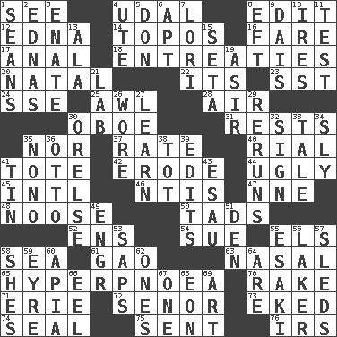 ACROSS 1. Observe 4. Allodial 8. Prepare for publication 12. Pulitzer Prize-winning author Ferber 14. Traditional theme or motif 16. Conductor's collection 17. Of or related to the anus 18. Pleas 20. Relating to or accompanying birth 22. It is 23. Fast jet (abbr.) 24. Compass dir. 25. Leather borer 28. Atmosphere 30. Mitch Miller's instrument 31. Musical pauses 35. And not 37. Pace 40. Monetary unit of Yemen 41. Haul 42. Wear away 44. Unsightly 45. International (abbr.) 46. Nuclear Threat Initiatives 47. Compass dir. 48. Trap for birds or small mammals 50. Bits 52. Followers of ems 54. Institute legal proceedings 55. Raised railways 58. Ocean 61. E Mali city 63. Rhinal 65. Abnormally rapid or deep breathing 70. Libertine 71. One of the Great Lakes 72. Sir (Sp.) 73. Made supply last 74. Lick closed 75. Transmitted 76. Big collection agency DOWN 1. Actors Connery and Penn 2. Ferber et al. 3. Related on the mother's side 4. Shoshoni 5. Spanish title 6. Fitting 7. Australian parrot (variant) 8. Bank Draft (abbr.) 9. Raised platform 10. Angers 11. Trial 13. In the manner of 15. Bristle 19. SW Saudi Arabia district 21. Experiment locale 26. Had on 27. Acquire or gain knowledge or skills 29. Summer TV shows 30. Threatening words 32. Signal 33. Falsehood 34. Playfully artful 35. Words to Nanette 36. "Beetle Bailey" pooch 38. Small child 39. Prepares for publication 41. Shallow baking pan 43. Son of Isaac 49. Engineer (abbr.) 51. Lair 53. Plant excrements 55. 1973 Nobel Price Winner (Physics) Leo 56. Member of a famous L.A. basketball team 57. Bobsleighs 58. "______ My Girl" (Turtles hit) 59. Jane of fiction 60. Capital of Western Samoa 62. Washington bills 64. "We ___ not amused" (Victoria) 66. Snakelike fish 67. Single 68. A really long time 69. Nonscientific branch of learning