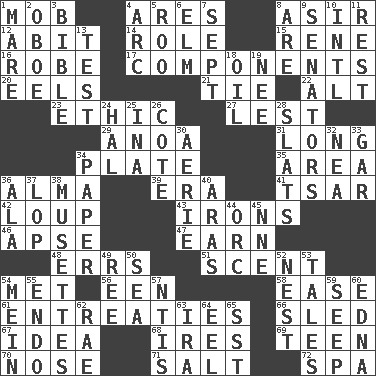 ACROSS 1. Disorderly crowd 4. Ancient Greek god of war 8. SW Saudi Arabia district 12. "This won't hurt ____!" 14. Hero or heavy, e.g. 15. French philosopher Descartes 16. Loose flowing garment 17. Parts 20. Snakelike fish 21. Make a knot 22. Keyboard modifier key 23. Value system 27. For fear that 29. Small Philippine buffalo 31. Protracted 34. Food holder 35. Length times width 36. _ mater 39. Epoch 41. Russian ruler of old 42. Central Nebraska county 43. Metal shackles 46. Domed church section 47. Merit 48. Blunders 51. Aroma 54. Was introduced to 56. Car or cant ending 58. Comfort 61. Pleas 66. Downhill vehicle 67. The content of cognition 68. Angers 69. Adolescent 70. Sense of smell 71. Table seasoning 72. Health resort DOWN 1. Female horse 2. Mitch Miller's instrument 3. The Good Book 4. Curve 5. Friend of Pooh 6. Shade tree 7. Back-to-school mo. 8. "We ___ not amused" (Victoria) 9. Elected representatives 10. International (abbr.) 11. State of inaction 13. Trial 18. Petroleum 19. Born 24. Actor Linden 25. _ tizzy (2 wds.) 26. ____ d'Azur (French Riviera) 28. Narrow boards 30. Nest on high 32. Teachers' org. 33. Slender fish 34. Some stationery 36. Wing 37. Chop off 38. French bagpipes 40. Caspian sea tributary 44. The grampus (Milton) 45. Compass dir. 49. Portuguese money of account (variant) 50. Ocean 52. Egg locale 53. Lies 54. Count _ (2 wds.) 55. Inside; within (prefix) 57. Nuclear Threat Initiatives 59. Ooze 60. Pulitzer Prize-winning author Ferber 62. Actress Charlotte 63. Lyricist Gershwin 64. Snakelike fish 65. Fast jet (abbr.)