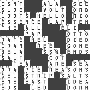 ACROSS 1. Is not 5. In the manner of 8. Perceive with the eye 11. A type of plum 12. Electrical Unit 14. Globe 15. Plunders 17. Phone greeting 18. _ de Janeiro 19. Gist 21. Infant locale 22. Nine, plus one 23. Definite Article 24. Everything 25. Connecticut Ivy Leaguer 27. Infant food 28. Von Bismarck 31. Pace 35. Cartoonist voice _ Blanc 37. Passed on 38. SW Asia republic 39. To riddle 41. Went 42. Actor Lugosi 43. Compass dir. 45. Extremities 46. Table seasoning 47. Small bed 49. Afternoon social gathering 51. "We ___ not amused" (Victoria) 52. Ocean 55. Mouth or opening 57. Sliced dessert 60. Thinks logically 62. Set 63. Long narrow piece of something 65. Table seasonings 66. Compass dir. 67. Compass direction 68. The main thing one is thinking about 69. Begley and Asner 70. Directed 71. Dormintory (informal) DOWN 1. Small island 2. Splash clumsily 3. Trap for birds or small mammals 4. False hair 5. "___ Maria" 6. Hang loosely or laxly 7. Silent film actress Nazimova 8. Drawing lots 9. 4th largest of the Great Lakes 10. Inky black, to poets 13. Drink excessively 16. Fastener 17. Aide 20. Burrowing marine mollusk 26. Inn 29. Watch over 30. Lyric poems 31. Teases 32. Length times width 33. Baron Munchausen's specialties 34. Maternal 36. French article 40. Fortification 44. Had on 48. Afternoon social gatherings 50. Domed church section 52. Twentieth part of a lira 53. Keyboard key 54. Indian state 55. Double curve, resembling the letter S 56. Tear apart 58. Slanted text style (abbr.) 59. Celtic language 61. Alleged 64. It would