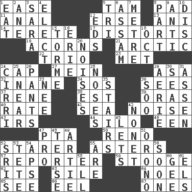 ACROSS 1. Relaxation 5. Scottish cap 8. Groovy apt. 11. Of or related to the anus 12. Celtic language 13. Cuckoo 14. Cylindrical with tapered ends 17. What propaganda does 19. Oak nuts 21. Northern region 22. Musical group of three 23. Was introduced to 24. Head covering 27. Chow _ 29. White ___ sheet 32. Empty; void 34. Distress signal 36. Perceives with the eye 37. French philosopher Descartes 38. Eastern Standard Time (abbr.) 39. Mouths or openings 40. Assign a rank or rating to 41. Ocean 42. Annoying sound 43. Big collection agency 44. Grain storage tower 46. Car or cant ending 47. Parent Teacher Association (abbr.) 50. Western Nevada city 52. A viewer who gazes fixedly 55. Michaelmas daisies 57. Newsperson 59. Moe Howard, for one 62. It is 63. Drop; flow; fall 64. Christmas carol 65. Perceive with the eye 66. Snakelike fish 67. Washington bills DOWN 1. Ingest 2. One (Scot) 3. "Two Mules for Sister ____" 4. Opt 5. Three (prefix) 6. Indian state 7. Distance measurement (Brit.) 8. Role in a play 9. Opposed to 10. Compact _ 12. Begley and Asner 15. Singer Mel 16. 4th largest of the Great Lakes 18. Sep. follower 20. Annoying sounds 24. High-altitude cloud 25. Approach 26. Leg coverings 28. Olfactory organs 29. Nest on high 30. Gospel singer Marvin 31. NE Netherlands city 33. Born 35. Flight of steps 36. "Barney Miller" actor Jack 42. Music written for nine 45. Allows 47. Adept person 48. Laconic 49. Nick name for Arthur 51. U. of Maine site 52. Indian titles of respect 53. False hair 54. Domed church section 55. "We ___ not amused" (Victoria) 56. Within a short period 58. Pipe bend 60. Turn to the right 61. Raised railways