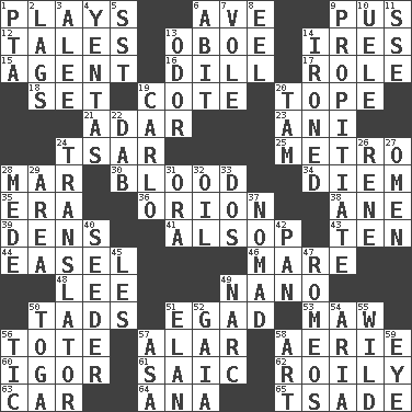 ACROSS 1. Live dramatic performances 6. "___ Maria" 9. Fluid product of inflammation 12. Stories 13. Mitch Miller's instrument 14. Angers 15. Representative 16. Deli pickle 17. Hero or heavy, e.g. 18. Put into a specified state 19. ____ d'Azur (French Riviera) 20. Drink excessively 21. The sixth month of the Jewish calendar 23. Cuckoo 24. Russian ruler of old 25. Paris' subway 28. Make imperfect 30. Vital fluid 34. South Vietnam president (1954) 35. Period 36. Greek mythologigal hunter 38. One (Scot) 39. Habitations of wild animals 41. Columnist Joseph or Stewart 43. Nine, plus one 44. Artist's stand 46. Female horse 48. Area sheltered from the wind 49. Billionth: prefix 50. Bits 51. Mild oath 53. Informal term for the mouth 56. Carry 57. Having or resembling wings 58. Nest on high 60. Composer Stravinsky 61. Ketch in the Levant 62. Agitated, as a liquid 63. Automobile 64. Santa ___, CA 65. Sadhe (variant) DOWN 1. Parent Teacher Assoc. 2. Falls behind 3. Toward shelter 4. Gossips 5. Fast jet (abbr.) 6. "This won't hurt ____!" 7. Grand slam 8. Snakelike fish 9. Conciliate 10. Ubangi River tributary 11. Compass dir. 13. Scent 14. Pressed 19. Monte _, Las Vegas Hotel/Casino 20. Scottish cap 22. Small moist lump or mass 24. Interpreter 26. French philosopher Descartes 27. Sign of things to come 28. Ancient Persian 29. Type of rug 31. Mouth or opening 32. Petroleum 33. Two (Sp.) 37. Wanderer 40. Sowing specialist 42. Baking dish 45. French article 47. Lover boys 49. Drug cop 50. Ancient Roman robe 51. Liveliness 52. Greek goddess of the earth (variant) 54. Roberta Peters solo 55. Rampant 56. Nervous spasm 57. White ___ sheet 58. Nonscientific branch of learning 59. Sight organ