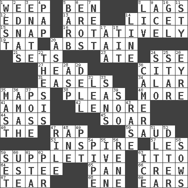 ACROSS 1. Shed a tear 5. Benjamin's nick name 8. Straggles 12. Pulitzer Prize-winning author Ferber 13. "We ___ not amused" (Victoria) 14. It is permitted: Lat. 15. Fastener 16. Rotating or pertaining to rotation 19. Make lace 20. Choose not to consume 21. Arranges properly for use 23. Had dinner 24. Compass dir. 27. Froth on beer 30. Municipality 31. Artist's stands 34. Having or resembling wings 35. Atlas contents 38. Entreaties 40. Greater amount 41. Mine, in Marseilles 42. Poe poem 44. Backtalk 45. Fly high 46. Definite Article 47. Hit sharply and swiftly 50. Saudi Arabian king (1953-1964) 53. Stimulate to action 57. French article 59. Supplying deficiencies 63. "Tell ____ the Marines!" 64. First name in cosmetics 65. Baking dish 66. Group working together 67. Separate forcefully 68. Compass dir. 69. Hearing organs DOWN 1. 270 degrees 2. Ferber et al. 3. Maternal 4. Infant food 5. Sharp remark 6. Greek god of love 7. Remaining after all deductions 8. 54 in ancient Rome 9. Adept person 10. Set 11. Filthy place 14. Actor's bit 17. American Automobile Association (abbr.) 18. Teat (slang) 20. At sea 22. College paper 24. Grain storage tower 25. Play the lead 26. Jane of fiction 28. Cleo's killer 29. Small valley 30. Device for capturing images 32. Area sheltered from the wind 33. Without 35. Vertical spar for supporting sails 36. Nursemaid 37. Airs 39. "Barney Miller" actor Jack 43. To erase 47. Cause heat under the collar 48. One (Scot) 49. Pacific Standard Time (abbr.) 51. Extremist 52. Prevent from occurring 54. Corncob 55. "Terrible" tsar 56. French philosopher Descartes 58. Sty mamas 59. Put into a specified state 60. Purpose 61. Parent Teacher Association (abbr.) 62. For each 63. Frozen water