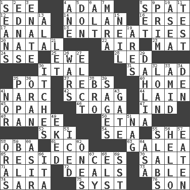 ACROSS 1. Observe 4. First man 8. Petty quarrel 12. Pulitzer Prize-winning author Ferber 14. Pitcher Ryan 16. Celtic language 17. Of or related to the anus 18. Pleas 20. Brizilian seaport 22. Atmosphere 23. Floor covering 24. Compass dir. 25. She-sheep 28. Directed 30. Slanted text style (abbr.) 31. Vegetable dish 35. Cooking vessel 37. Confederate soldiers (slang) 40. Dwelling 41. Drug cop 42. Lean end of the neck 44. (Had) reclined 45. Brightly colored fish 46. Ancient Roman robe 47. Working for oneself (abbr.) 48. The wife of a rajah (variant) 50. Inactive volcano in Sicily 52. What Jean-Claude Killy likes to do 54. Ocean 55. A female animal or person 58. Chief or king in Benin or Nigeria 61. Environmental prefix 63. An organ shaped like a helmet 65. Homes 70. Table seasoning 71. Came down and settled, as after flight 72. Allots cards 73. Competent 74. "Two Mules for Sister ____" 75. System (abbr.) 76. Boy, to dad DOWN 1. Seines 2. Ferber et al. 3. Maternal 4. A saturated hydrocarbon 5. Spanish title 6. Keyboard modifier key 7. Hindu Mythology: god of death 8. Put into a specified state 9. Demure 10. Toward the sea 11. Trial 13. According to 15. Famous astronaut Armstrong 19. Ancient Greek god of war 21. Allow 26. Armed conflicts 27. Voters do this 29. Mexican or Central American flower 30. Skin irritations 32. Grant temporary use of 33. Among 34. Lair 35. Dad 36. Northwest Algerian city 38. Sis' sibling 39. Gurus 41. Not either 43. Yard entry 49. Made supply last 51. Tired old horse 53. On the rocks 55. Broad, flat, thick pieces 56. Phone greeting 57. Eroded 58. Mouths or openings 59. Actor Lugosi 60. SW Saudi Arabia district 62. Singles 64. White ___ sheet 66. Call ___ day 67. Island 68. Raised railways 69. Fast jet (abbr.)