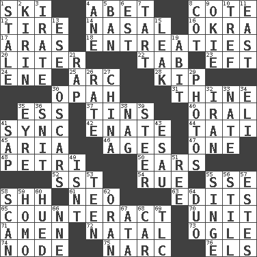 ACROSS 1. What Jean-Claude Killy likes to do 4. Collude with 8. ____ d'Azur (French Riviera) 12. Hoop that covers a wheel 14. Relating to the nose 16. Gumbo ingredient 17. Ancient river in northeast Turkey 18. Pleas 20. 61 cubic inches 22. Keyboard key 23. Bank Draft (abbr.) 24. Compass dir. 25. Curve 28. Sleep 30. Brightly colored fish 31. One or ones belonging to thee 35. Curvy letter 37. Canisters 40. Of the mouth 41. Synchronize (abbr.) 42. Maternal 44. Jacques of French films 45. Operatic vocal solo 46. Grows older 47. Single 48. _ dish (used to culture cells) 50. Hearing organs 52. Fast jet (abbr.) 54. Regret 55. Compass dir. 58. Quiet! 61. Modern: prefix 63. Proofreads 65. Neutralize 70. A single undivided whole 71. So be it 72. Relating to or accompanying birth 73. Stare 74. Connecting point 75. Drug cop 76. Raised railways DOWN 1. Showing deterioration from age 2. Japanese brewing company 3. Feeling or showing extreme anger 4. One (Scot) 5. Prohibit 6. Eastern Standard Time (abbr.) 7. Small pie 8. Small bed 9. Migrant worker of the '30s 10. Not kosher 11. Compass direction 13. Compass dir. 15. Path through which fluid escapes 19. "This won't hurt ____!" 21. Reproach for some lapse or misdeed 26. Assign a rank or rating to 27. Large country 29. Pictures 30. Motion picture awards 32. SW Asia republic 33. Nathan's nickname 34. Connecticut Ivy Leaguer 35. Jane of fiction 36. In a ____ (agitated or irritated) 38. Tired old horse 39. Navigate 41. Plant excrement 43. He sold his birthright 49. Is not 51. To riddle 53. Adolescent 55. Burn superficially 56. Free of sound 57. _____ Park, CO 58. Examine minutely or intensely 59. Like (prefix) 60. Took on color 62. Northwest Algerian city 64. Superhero pair 66. Compass dir. 67. "One Day ___ Time" 68. Auto 69. Affectionate concern, for short